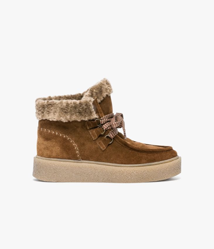 Un boots cognac en cuir velours au fini huilé fabriqué avec soin au Portugal. Il apportera une touche réconfortante à toutes les tenues avec son intérieur doublé fausse fourrure et son épaisse semelle aspect crêpe. Il présente une couture en relief sur le plateau et des points échelle au talon. Doté d'une languette à soufflet, ce boots femme s'enfile facilement et s'ajuste grâce à des lacets bicolores coulissant dans des anneaux en métal vieilli. Une chaussure très confortable avec semelle intérieure cuir moussée amovible. Cette paire bénéficie du montage Strobel qui consiste à coudre directement la tige à la première de montage lors de la piqûre. Cette technique apporte une réelle robustesse et de la souplesse. Semelle 2,5 cm.