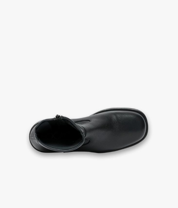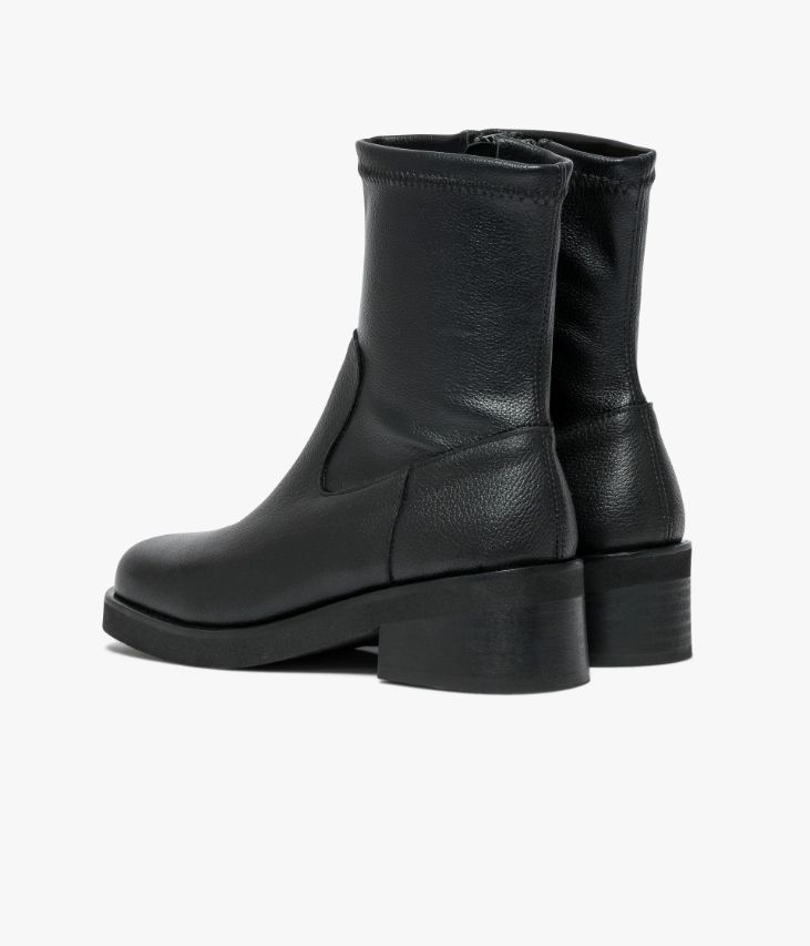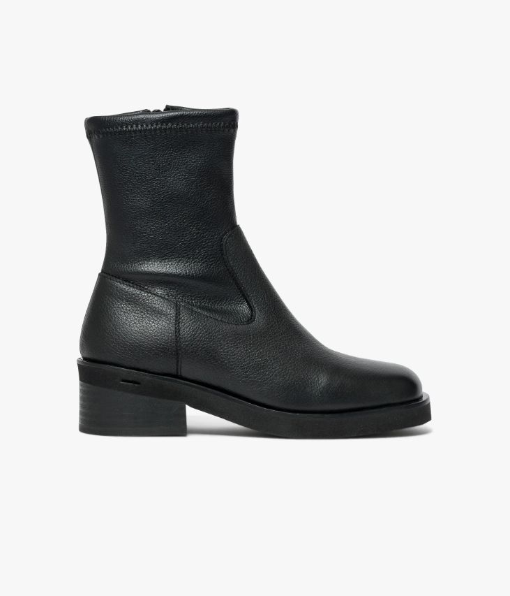Un boots noir en cuir grainé fabriqué avec le plus grand soin. Un boots citadin au look épuré avec bout carré et tige en textile souple non doublée qui épouse la cheville. Une bottine femme avec semelle intérieure cuir dotée d’une fine mousse. Elle repose sur une épaisse semelle légère et un large talon. Fermeture par zip intérieur.