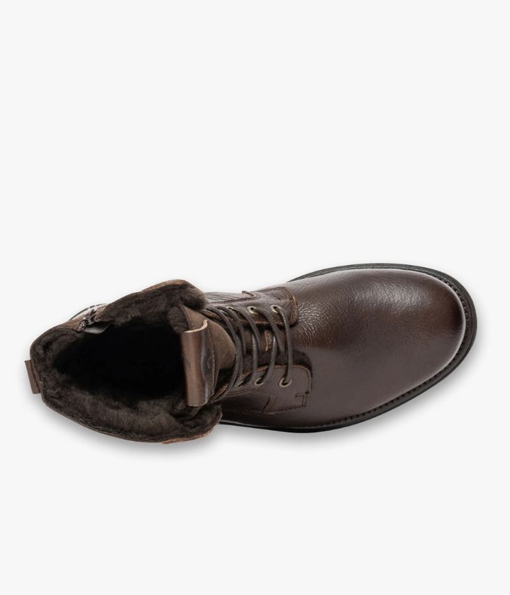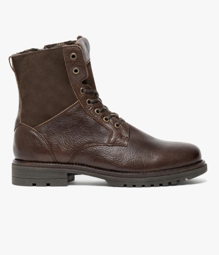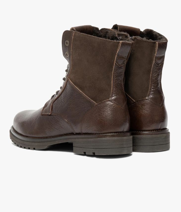 Un boot en cuir couleur café fabriqué avec soin au Portugal. Réalisé en cuir veiné aux reflets patinés, il possède une tige souple et une languette en cuir velours. Doté d’une doublure en fausse fourrure et d’une semelle intérieure cuir moussée, il offre un grand confort. Ce boots pour homme possède une double fermeture par lacets pour un ajustement parfait et zip intérieur pour plus de simplicité. Il repose sur une semelle crantée avec trépointe cuir piquée.