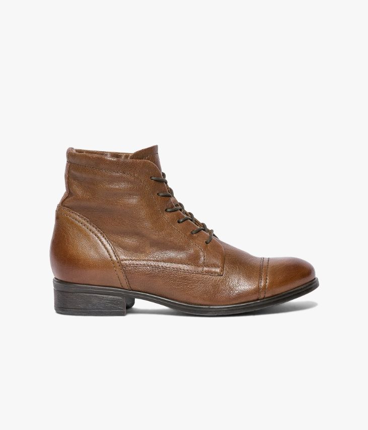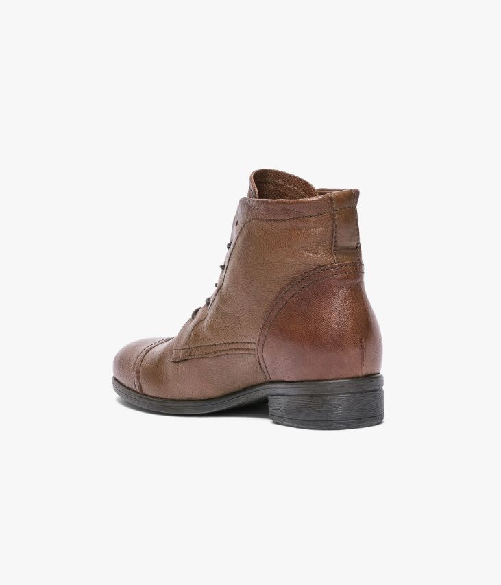 Boots noisette en cuir lisse à lacets avec intérieur doublé imitation fourrure. Un boots femme noisette esprit godillot avec son bout amande et ses doubles surpiqûres. Son dessus en cuir lisse ultra-souple offre un excellent confort. Ce boots possède un empiècement surpiqué sur le bout du pied et un autre au niveau du talon. Ce boots vous garantit des pieds bien chauds tout l'hiver grâce à sa doublure imitation fourrure ultra confortable. Il se ferme par lacets sur le dessus. Un boots avec semelle intérieure cuir. Talon : 2 cm. Un boots chaud à porter avec un jean slim et un manteau court.