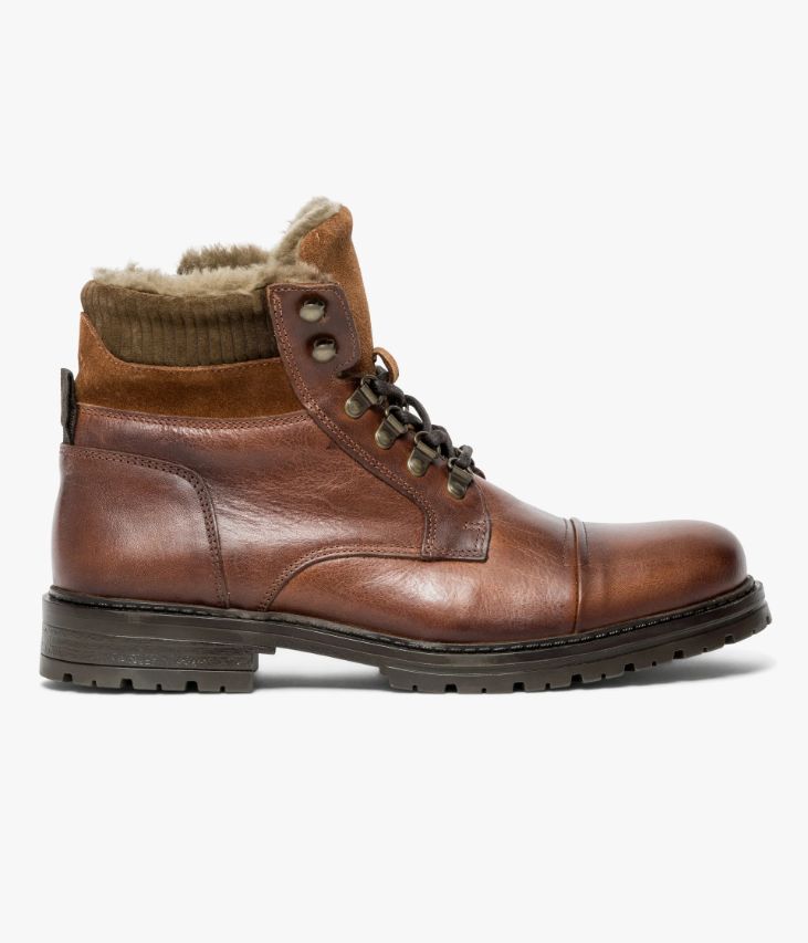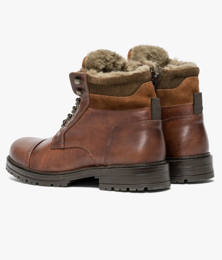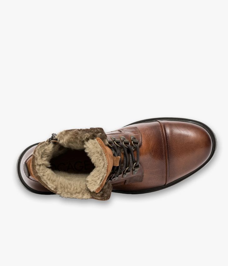 Un boots en cuir cognac fabriqué avec soin au Portugal. Un boots homme inspiré des chaussures de randonnée avec bout droit, laçage montagne et doublure en fausse fourrure. Des empiècements en cuir velours ton sur ton viennent discrètement orner le haut de la tige et la languette. Cette chaussure avec semelle intérieure cuir dotée d’une fine mousse repose sur une semelle crantée avec trépointe fantaisie. Elle s’ajuste à chaque pied grâce aux lacets et se ferme facilement par zip intérieur.