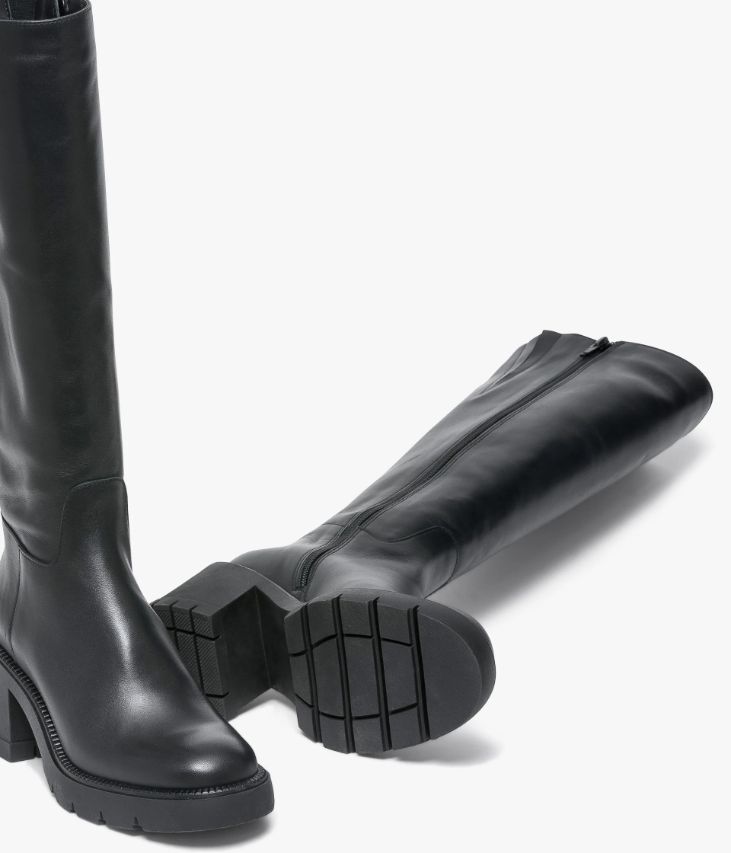 Une botte noire en cuir lisse fabriquée avecsoin au Portugal. Une botte élégante avec bout amande ettige ajustée au mollet posée sur une épaisse semelle avec trépointe cuirciselée qui lui donne une allure résolument contemporaine. Cette chaussure estentièrement doublée textile avec semelle intérieure cuir dotée d’une finemousse. Elle se ferme par zip intérieur et possède un élastique d’aisance enhaut de la tige. Semelle : 2 cm. Tour de mollet : 38 cm.