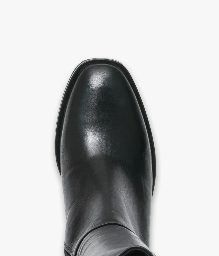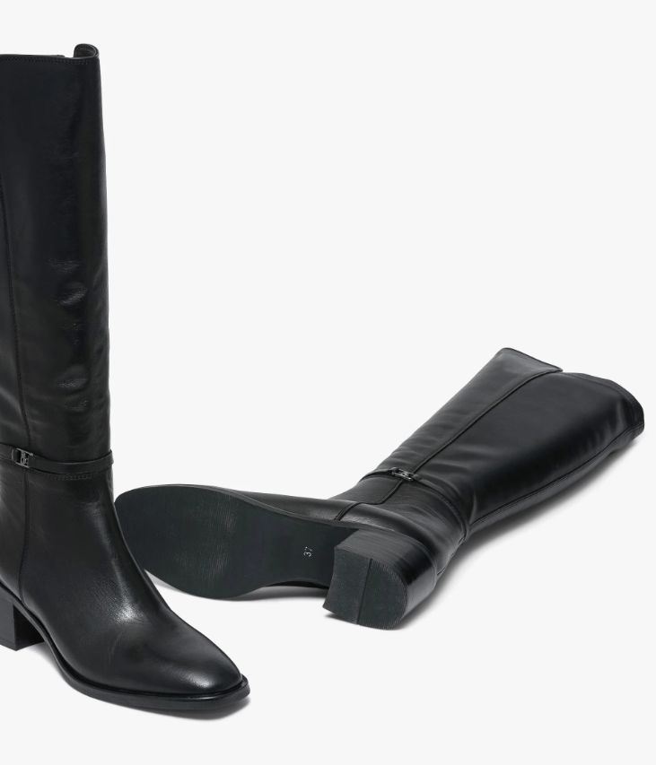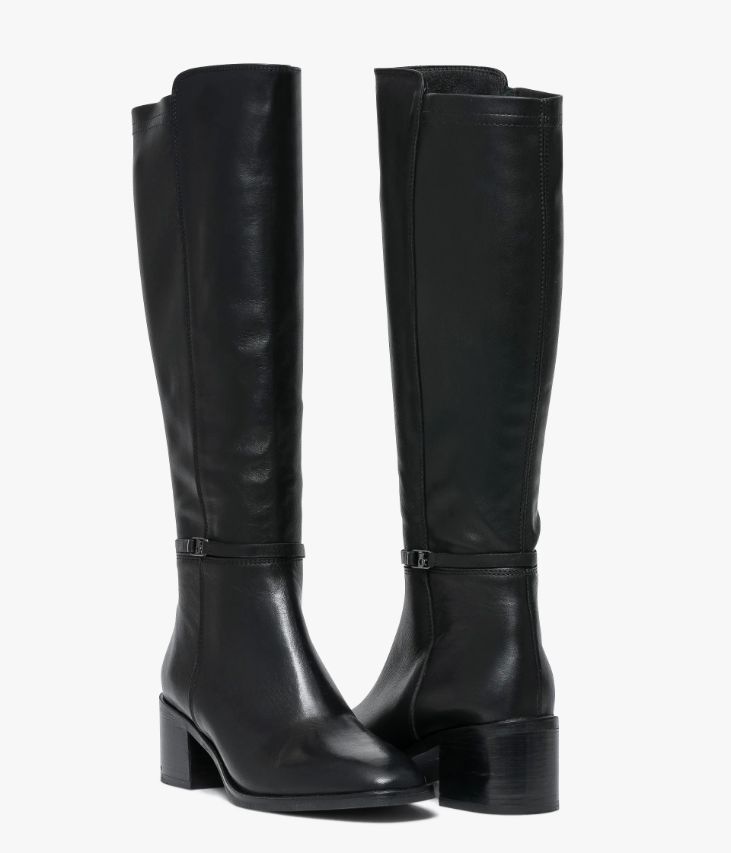 Une botte en cuir noir fabriquée avec le plus grand soin. Une botte femme avec bout carré aux lignes adoucies posée sur une trépointe débordante et un petit talon confortable. La tige, composée de cuir et de textile extensible, s'adapte à toutes les largeurs de mollets. Elle est sublimée par une fine bride avec logo signature autour de la cheville. Une botte doublée cuir et textile avec semelle intérieure cuir moussée. Elle se ferme à l'aide d'un zip intérieur. Tour de mollet 35 cm.