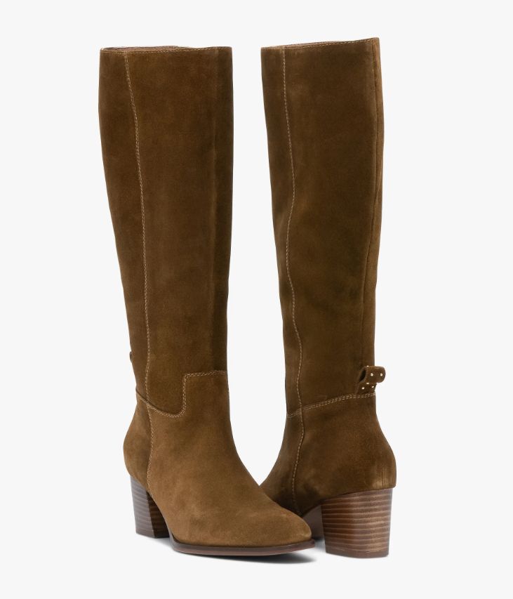 Une botte en cuir velours cognacconfectionnée avec soin. Une botte élégante avec bout amande et doubles surpiqûresà la cheville. Elle est agrémentée d’une petite tirette au talon incrustée depetits clous dorés. Une botte entièrement doublée cuir avec semelle intérieurecuir dotée d’une fine mousse. Elle possède un élastique d’aisance en haut de latige. Elle est posée sur une semelle fine avec trépointecuir ciselée et talon lamellé collé. Notre technologie Bocage Innovation vousgarantit un bien-être inégalé. La semelle dissimule des élastiques quipermettent à votre chaussure de s’adapter à votre pied. Fermeture par zip. Largeur de mollets : 38 cm.