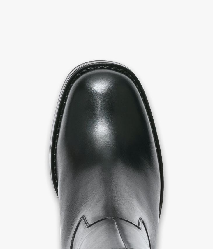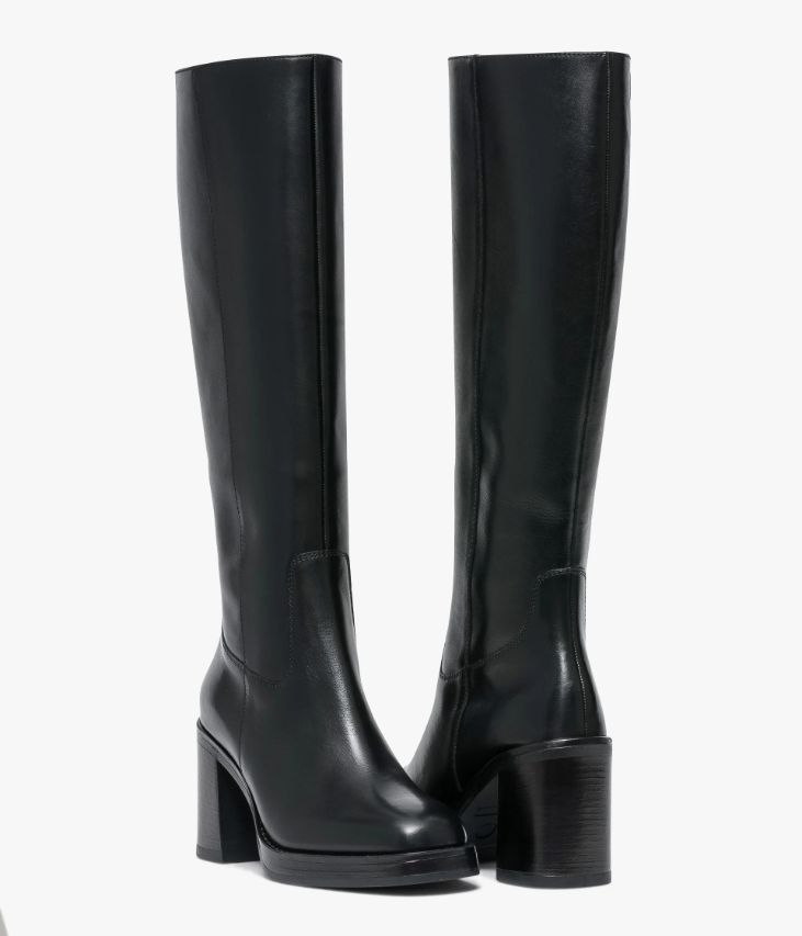 Une botte en cuir noir fabriquée avec le plus grand soin. Une botte à la fois féminine et tendance avec son bout carré et sa tige galbée qui épouse parfaitement le mollet. Elle repose sur une épaisse semelle qui vient adoucir la cambrure du talon. Une botte entièrement doublée cuir avec semelle intérieure cuir moussée. Elle se ferme par zip intérieur et possède un élastique d’aisance en haut de la tige. Tour de mollet 36 cm. Semelle 2 cm.