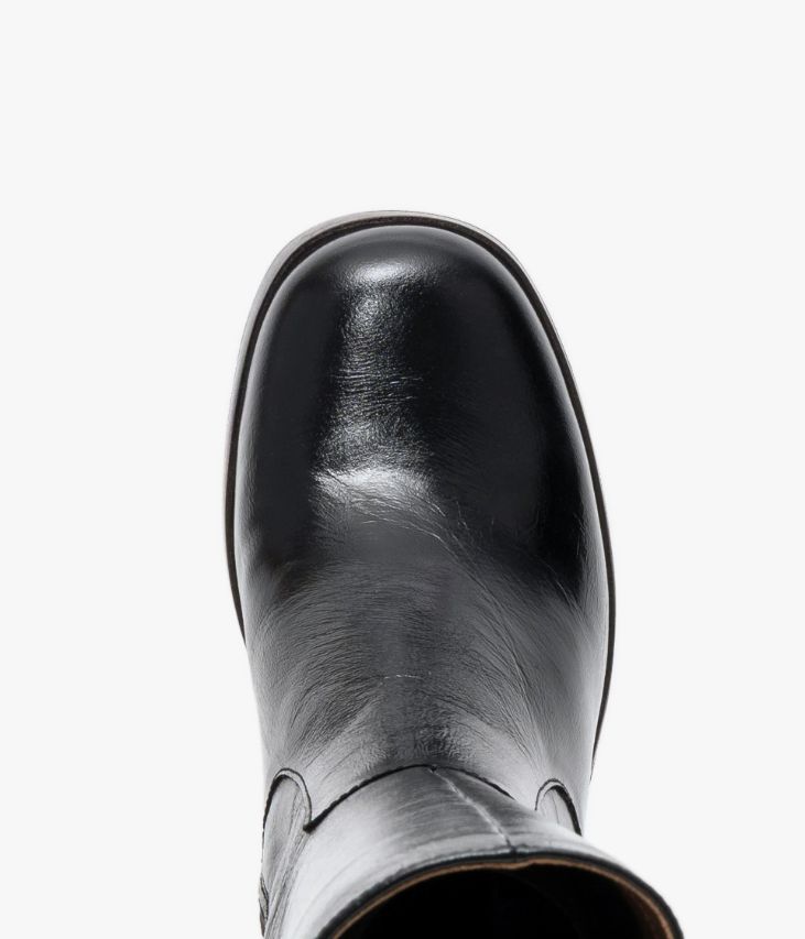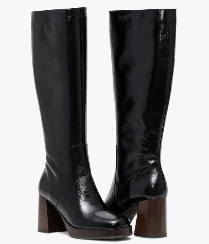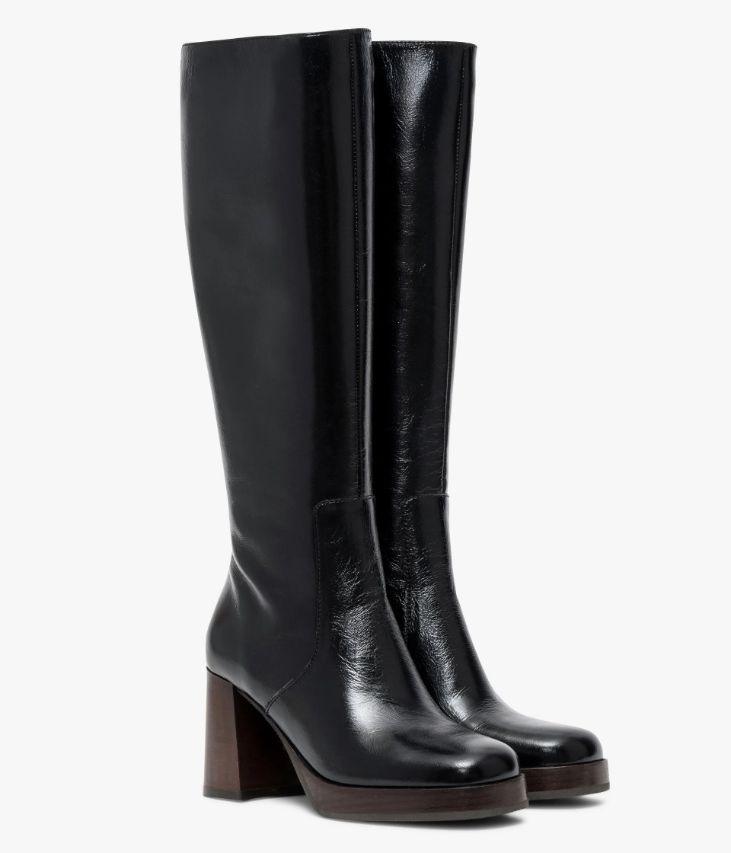 Une botte en cuir noir fabriquée avec le plus grand soin. Une botte femme à bout carré résolument rétro qui allie un cuir vintage aux reflets vernis à une plateforme ultra souple et un talon flare. Elle sublime la silhouette grâce à sa tige parfaitement ajustée au mollet. Une botte entièrement doublée cuir avec semelle intérieure cuir dotée d’une fine mousse. Son cuir vintage est un cuir d'aspect vieilli qui se patine avec le temps, un cuir brillant qui affiche un aspect plus ou moins froissé, dont la tonalité peut varier, et qui peut avoir un aspect "déjà porté". Fermeture par zip intérieur. Tour de mollet 36 cm. Plateforme 2 cm.