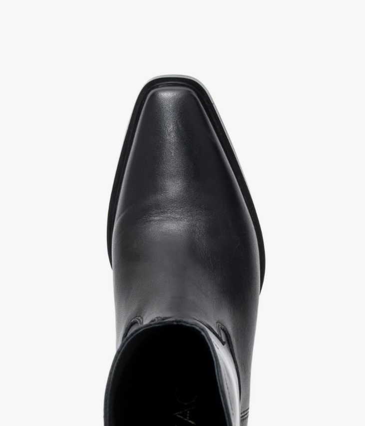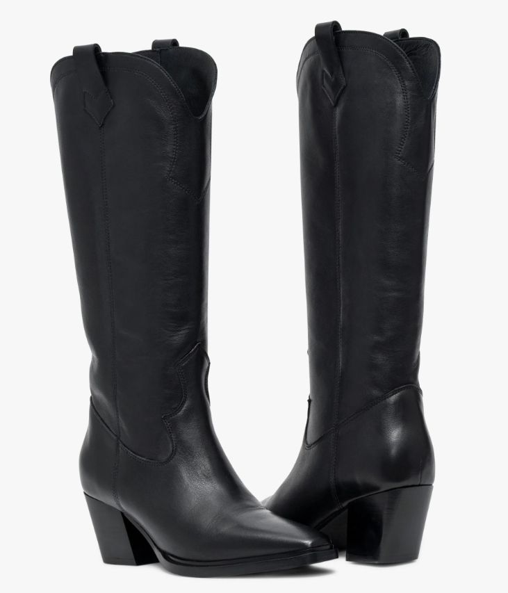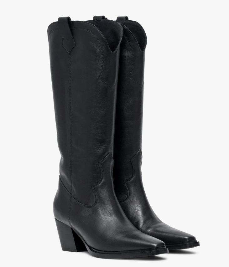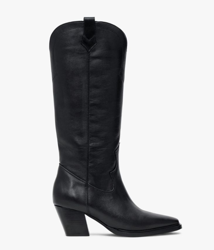 Une botte en cuir noir fabriquée avec soin au Portugal. Une botte féminine au design épuré inspiré de l’univers western avec bout carré effilé, surpiqûres en forme de flammes et tire-bottes de chaque côté de la tige. Elle repose sur une semelle débordante et un large talon en biseau lamellé collé. Une botte doublée cuir et coton recyclé, avec semelle intérieure cuir dotée d’une fine mousse. Elle se ferme à l’aide d’un demi-zip à la cheville. Tour de mollet 35 cm.