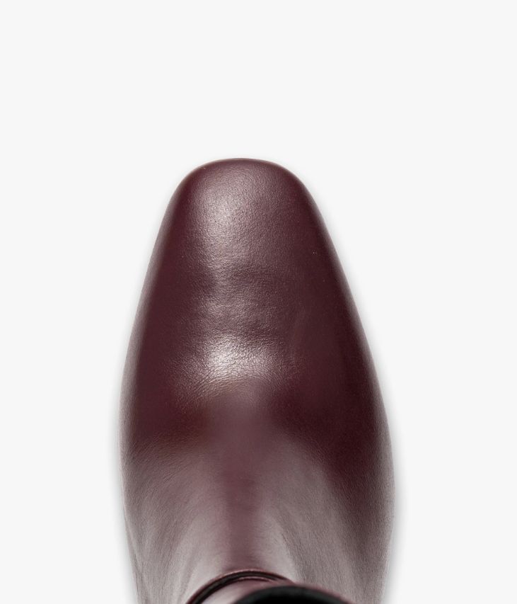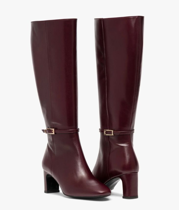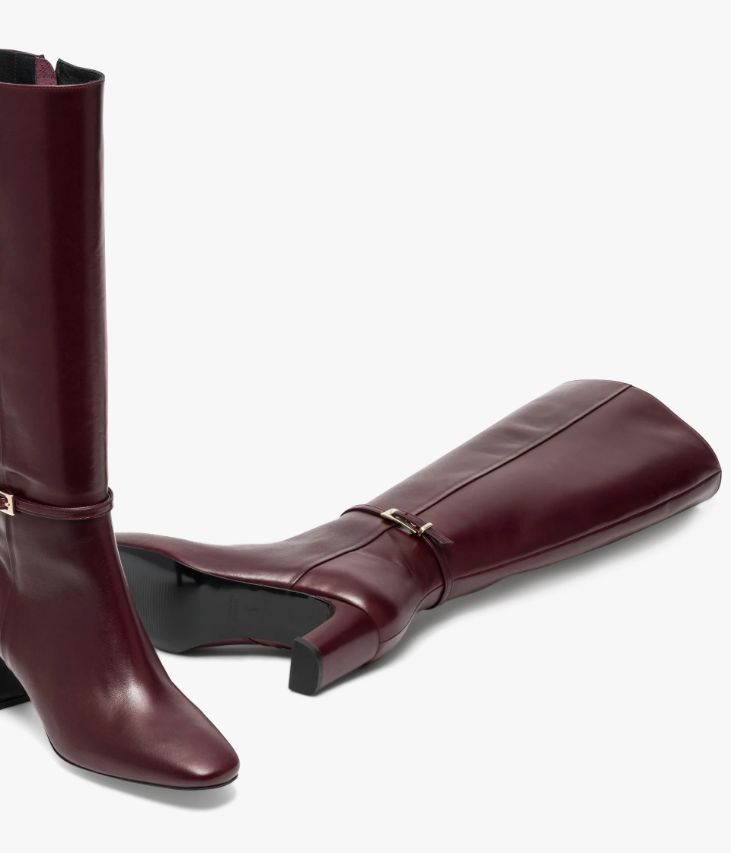 Une jolie botte en cuir lie-de-vin fabriquée avec soin au Portugal. Un modèle sophistiqué avec bout amande, tige galbée et fine bride autour de la cheville fermée par une délicate boucle dorée. Une botte femme entièrement doublée cuir avec semelle intérieure cuir dotée d’une fine mousse. Elle repose sur une semelle fine et un talon à gorge enrobé à la hauteur parfaite. Fermeture par zip intérieur. Elastique d’aisance en haut de la tige. Tour de mollet 35 cm.