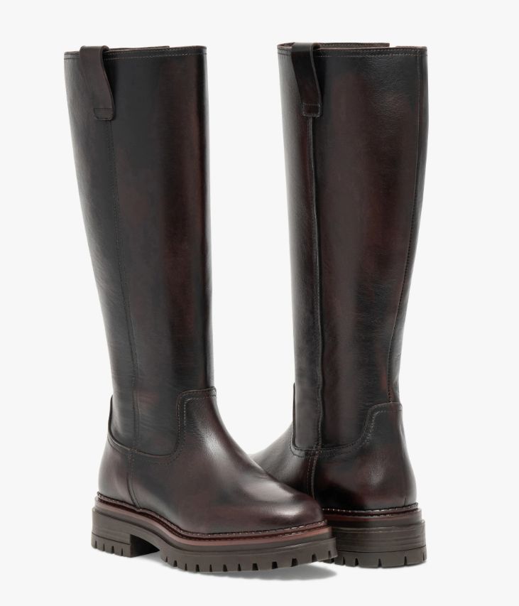 Une botte en cuir chocolat fabriquée avec soin au Portugal. Une botte cavalière au look résolument contemporain avec son épaisse semelle crantée et sa double trépointe fantaisie. Ce modèle en cuir lisse affiche un effet 2 tons aspect vieilli qui va se patiner au fil du temps. Il est agrémenté de doubles surpiqûres et d’une tirette en haut de la tige. Une botte entièrement doublée cuir avec semelle intérieure cuir dotée d’une fine mousse. Elle se ferme par un zip intérieur. Semelle 2,5 cm. Tour de mollet 34 cm.