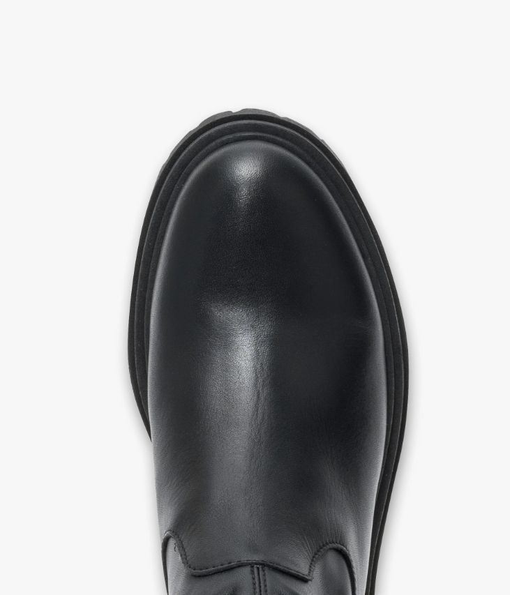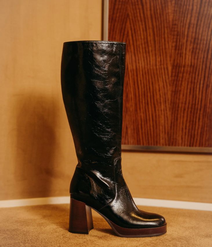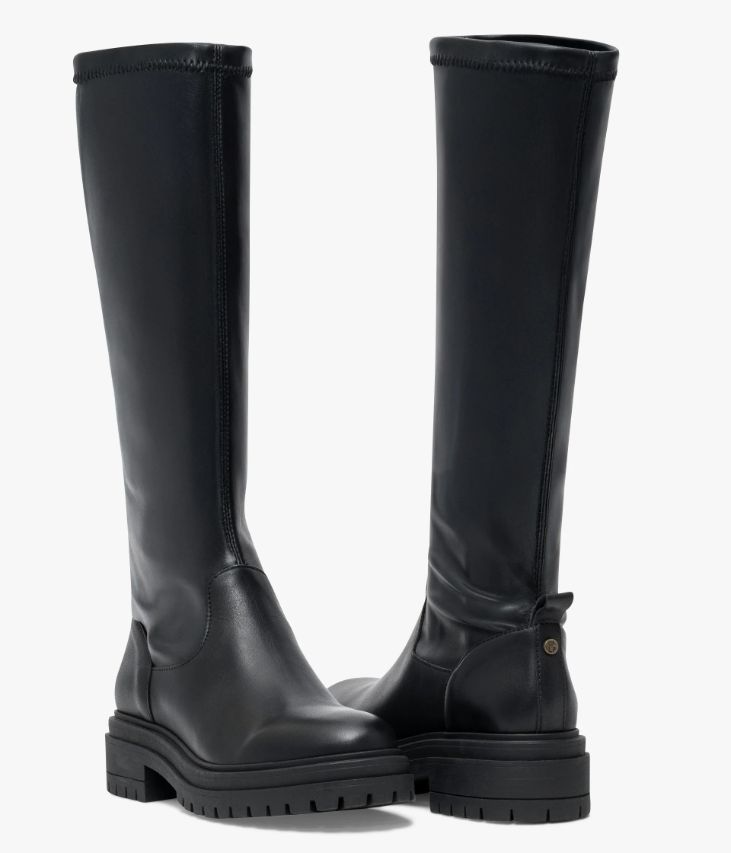 Une botte en cuir noir fabriquée avec soin au Portugal. Une botte à la ligne effilée avec bout amande et tige en synthétique parfaitement ajustée au mollet. Elle repose sur une épaisse semelle crantée qui lui confère une allure citadine dynamique. Une botte partiellement doublée cuir avec semelle intérieure cuir dotée d’une fine mousse. Elle s’enfile facilement grâce à sa tige extensible et sa tirette au talon. Semelle : 3 cm. Tour de mollet : 31 cm.