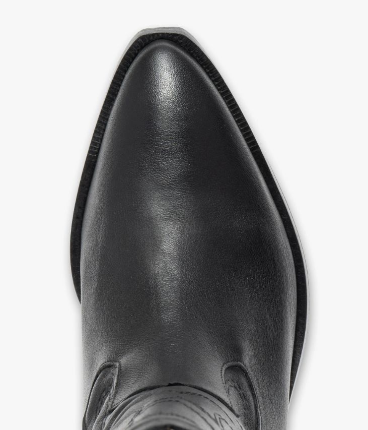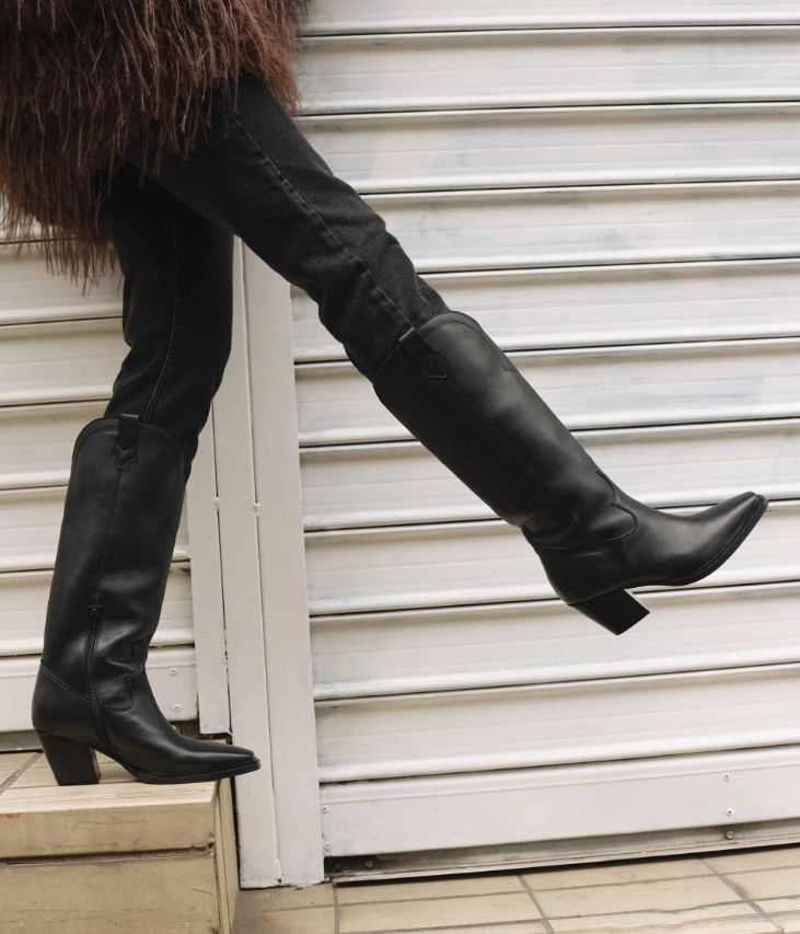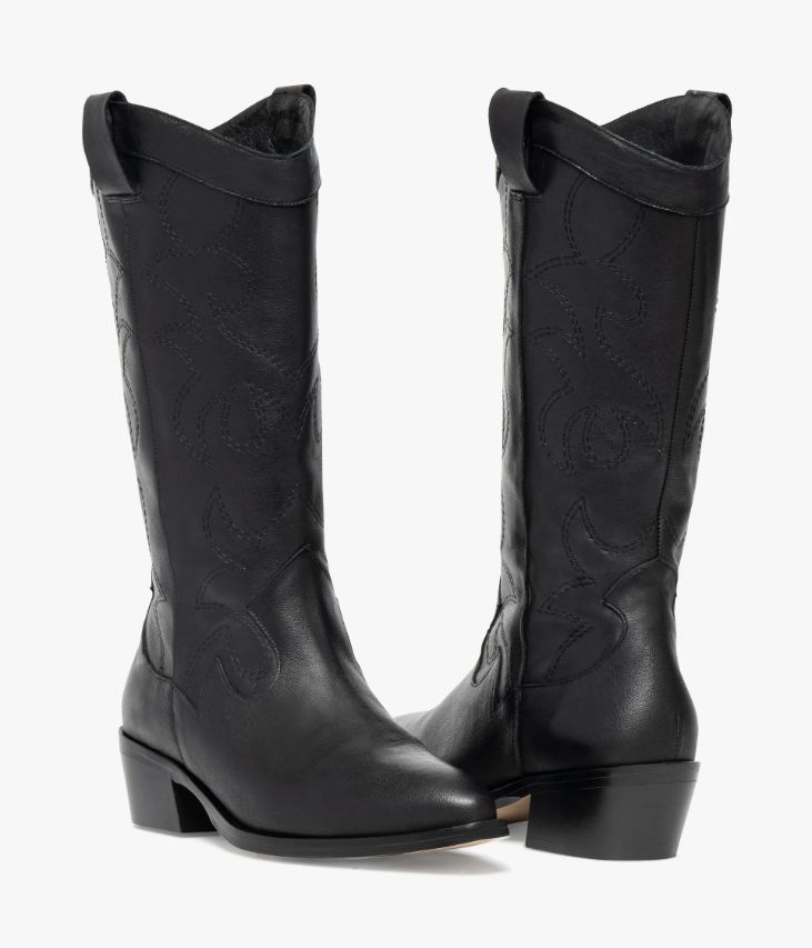 Une Santiag en cuir lisse noir fabriquée avec soin au Portugal. Une botte féminine aux accents western avec bout pointu, empiècements en forme de flamme, surpiqûres décoratives et tirettes de chaque côté de la tige. Elle repose sur une semelle à bout carré et un talon lamellé collé en biseau. Un botte entièrement doublée cuir avec semelle intérieure cuir moussée. Fermeture par demi-zip à la cheville. Tour de mollet : 35 cm.