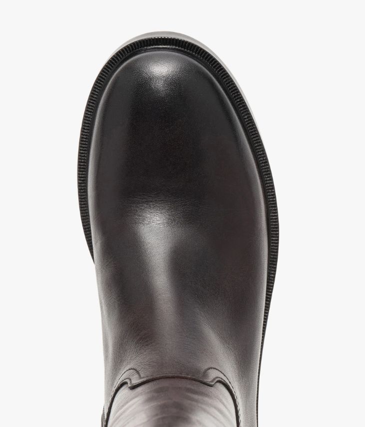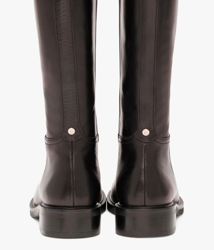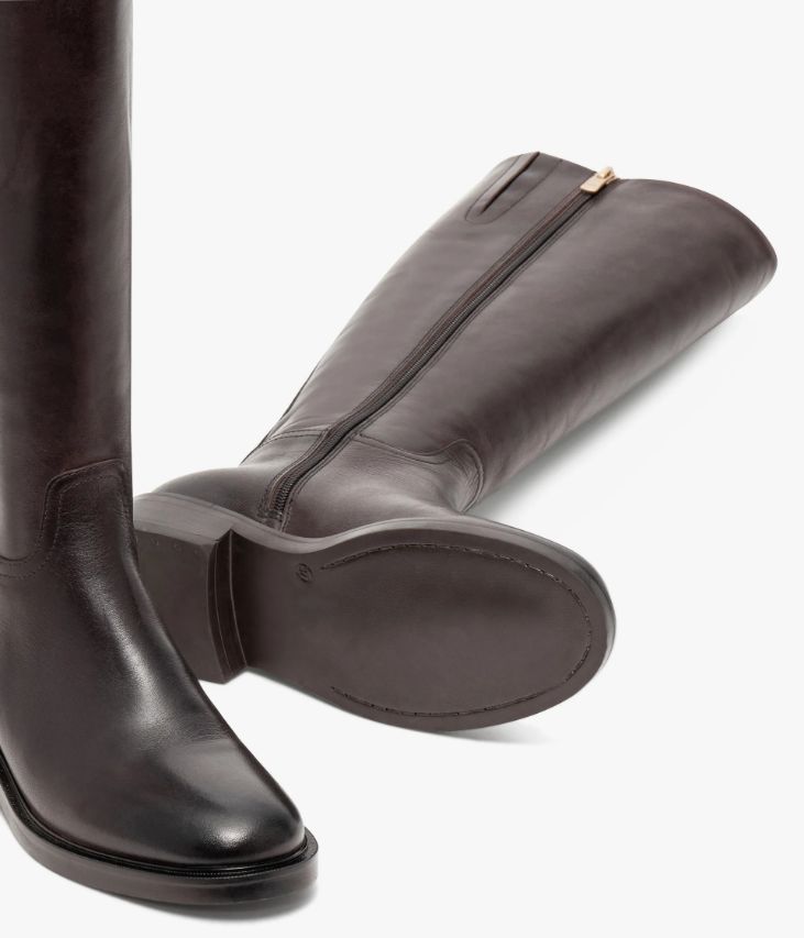 Une jolie botte en cuir chocolat effet 2 tons fabriquée avec le plus grand soin. Cette botte cavalière affiche une ligne sobre et élégante, avec bout arrondi et surpiqures à la cheville. La tige souple possède une finition asymétrique arrondie qui met le mollet en valeur et élance la silhouette. Une chaussure entièrement doublée cuir avec semelle intérieure cuir moussée. Elle se ferme à l’aide d’un zip intérieur et repose sur une semelle avec trépointe cuir ciselée et un large talon lamellé collé. Logo doré à l’arrière du talon. Elastique d’aisance en haut de la tige. Tour de mollet 35 cm.