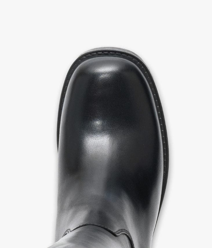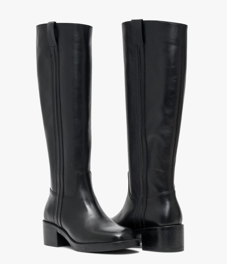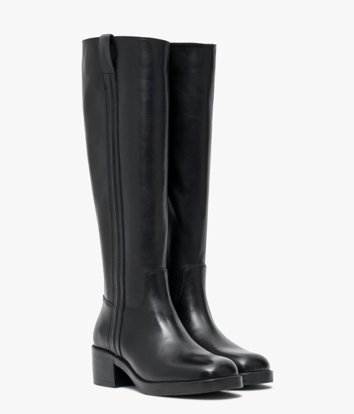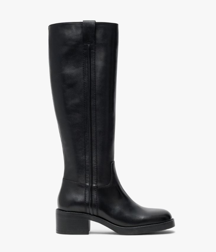 Une botte en cuir lisse noir fabriquée avec le plus grand soin. Une botte tube dont la tige est agrémentée d’une bande surpiquée au léger relief. Son bout carré lui assure une allure résolument contemporaine. Une chaussure doublée cuir sur la partie pied avec tige non doublée pour plus de souplesse et semelle intérieure cuir moussée. Elle repose sur une épaisse semelle et un large talon à la hauteur parfaite. Fermeture par demi-zip à la cheville. Semelle 1,5 cm. Tour de mollet : 35 cm.
