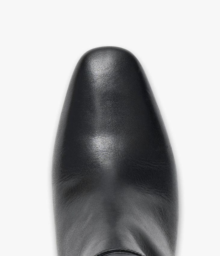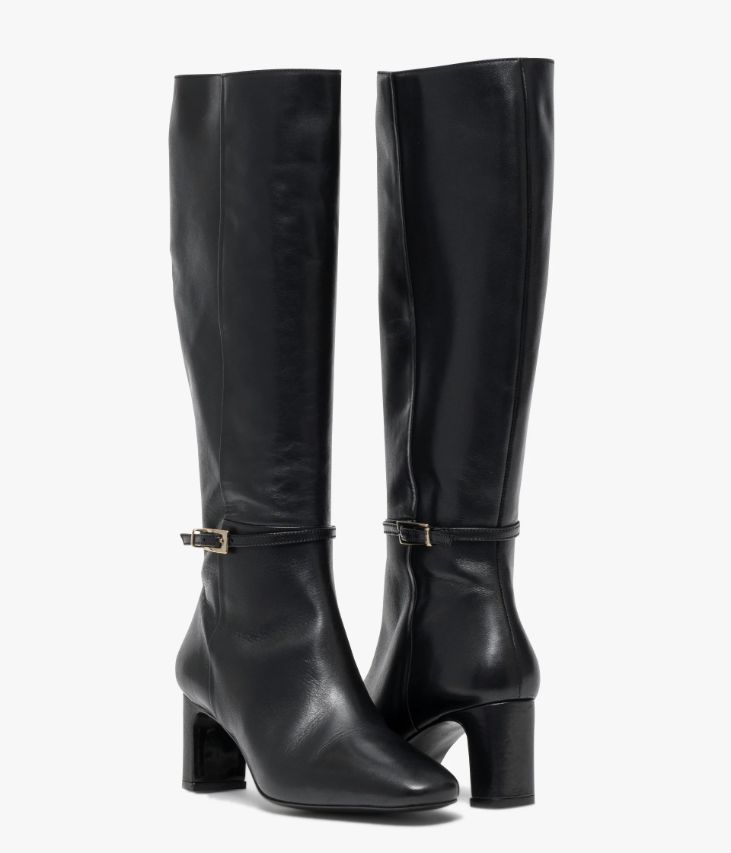 Une jolie botte en cuir noir fabriquée avec soin au Portugal. Un modèle sophistiqué avec bout amande, tige galbée et fine bride autour de la cheville fermée par une délicate boucle dorée. Une botte femme entièrement doublée cuir avec semelle intérieure cuir dotée d’une fine mousse. Elle repose sur une semelle fine et un talon à gorge enrobé à la hauteur parfaite. Fermeture par zip intérieur. Elastique d’aisance en haut de la tige. Tour de mollet 35 cm.