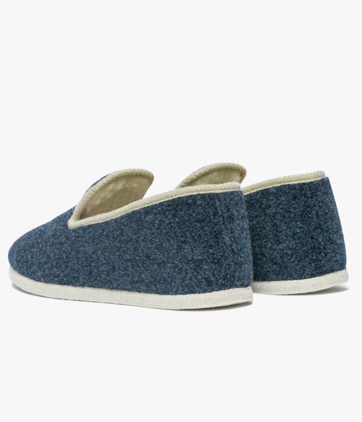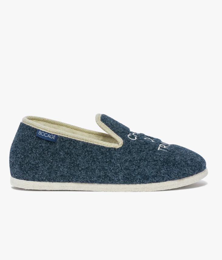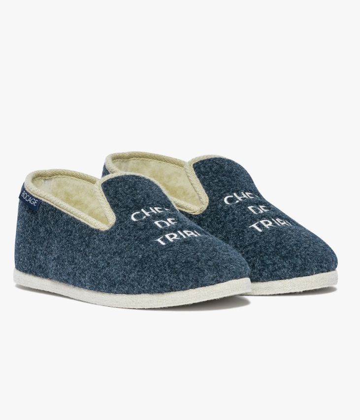 Un chausson bleu très confortable, esprit charentaise avec intérieur beige imitation laine. Sur le dessus, il est orné de message brodé « Chef de tribu ». Ce chausson possède de jolies finitions biais beige sur le col et une semelle en caoutchouc enrobée de feutrine. Ce chausson est manufacturé traditionnellement en France par l’Atelier Fargeot dans le respect du cousu-retourné depuis 1930. Cette paire de chaussons est livrée dans une pochette en coton avec liens coulissants, certifiée Oeko-Tex.