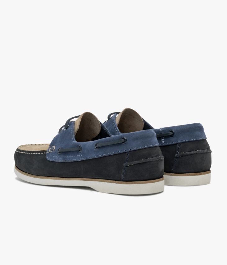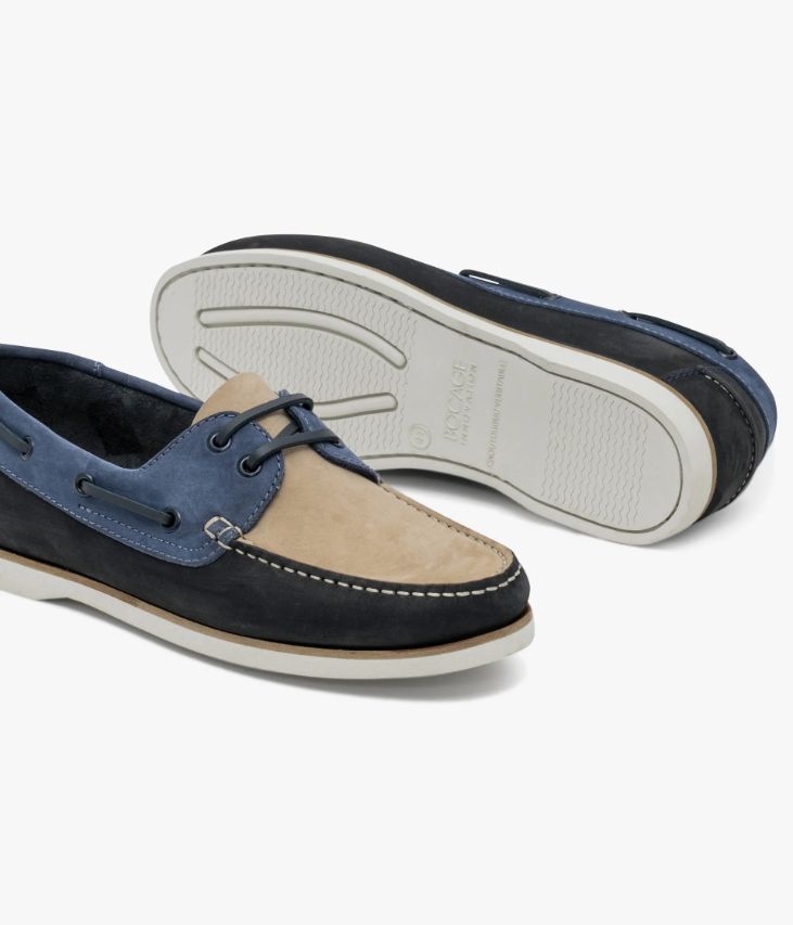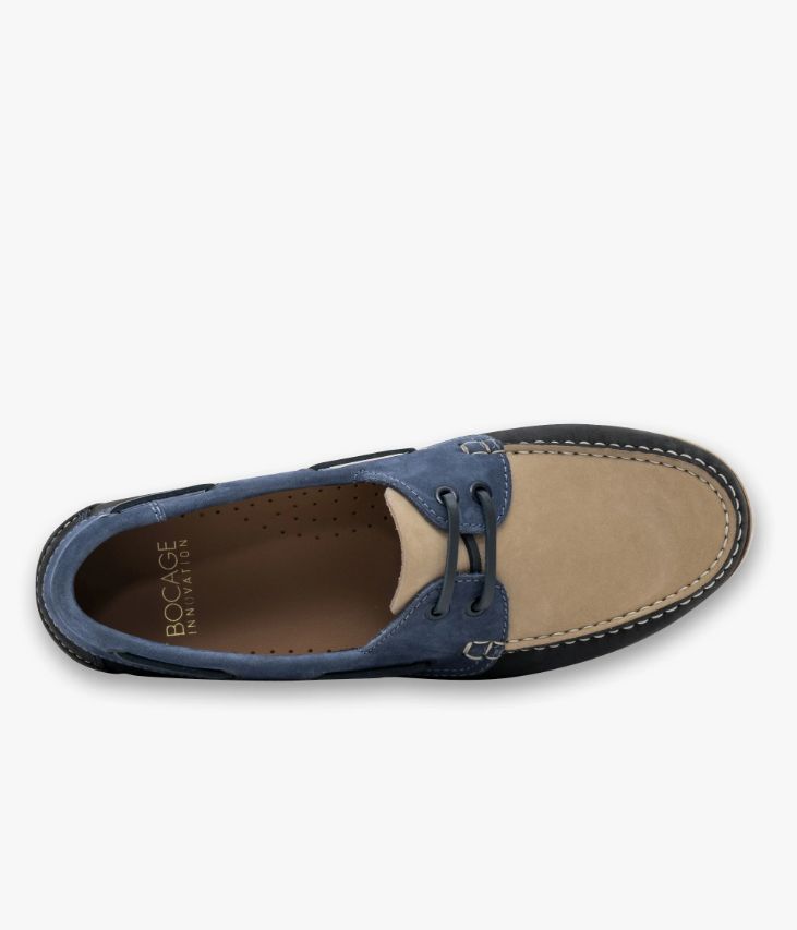 Une chaussure bateau en nubuck bleu et beige fabriquée avec soin au Portugal. Une chaussure estivale alliant bleu marine, bleu indigo et beige, avec lacet en cuir marine. Une chaussure avec semelle intérieure cuir dotée d’une fine mousse. Elle repose sur une semelle blanche en caoutchouc véritable avec trépointe cuir. Notre technologie Bocage Innovation vous garantit un bien-être inégalé. La semelle dissimule des élastiques qui permettent à votre chaussure de s’adapter à votre pied.