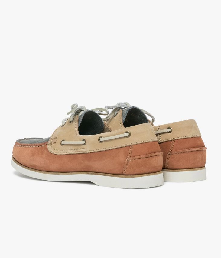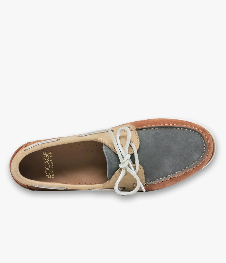 Unechaussure bateau terracotta en nubuck fabriquée avec soin dans notre atelier auPortugal. Une chaussure estivale avec dessus bleu, col beige et lacet en cuircouleur craie. Une chaussure entièrement doublée cuir avec semelle intérieurecuir dotée d’une fine mousse. Elle reposesur une semelle en caoutchouc blanc avec trépointe cuir. Notre technologieBocage Innovation vous garantit un bien-être inégalé. La semelle dissimule desélastiques qui permettent à votre chaussure de s’adapter à votre pied.