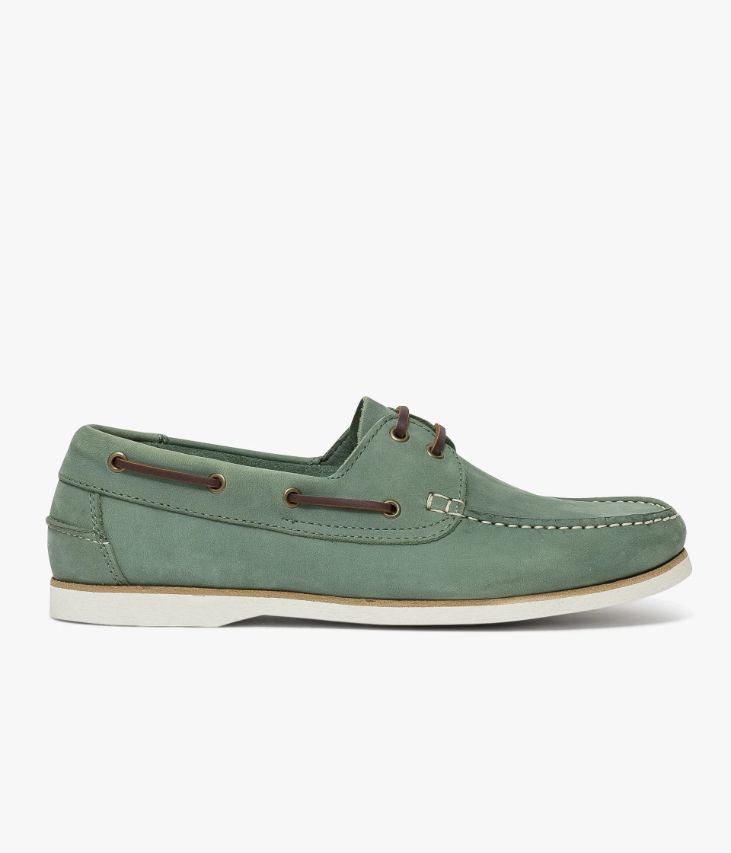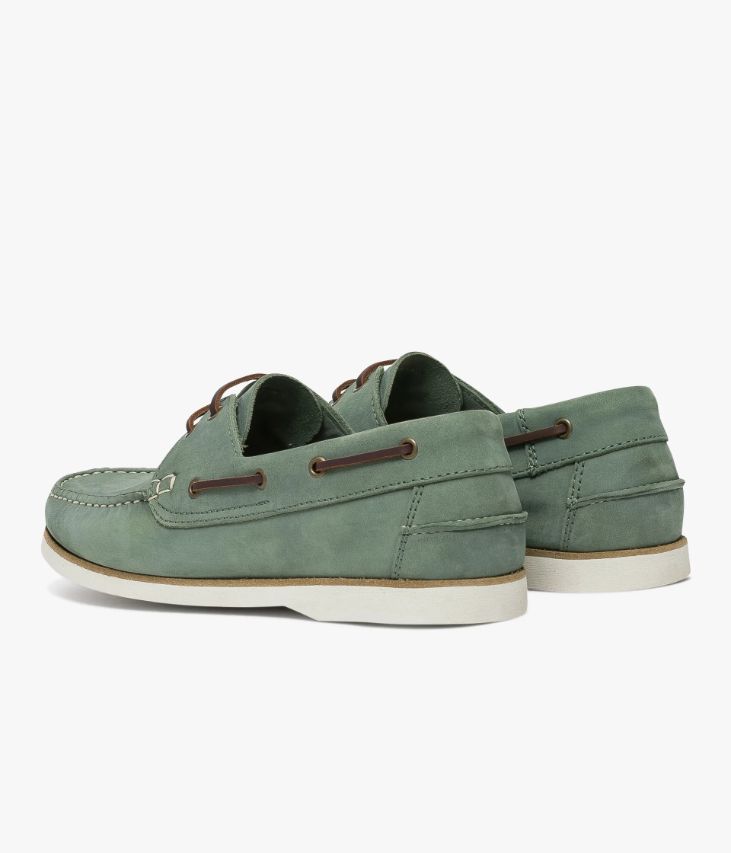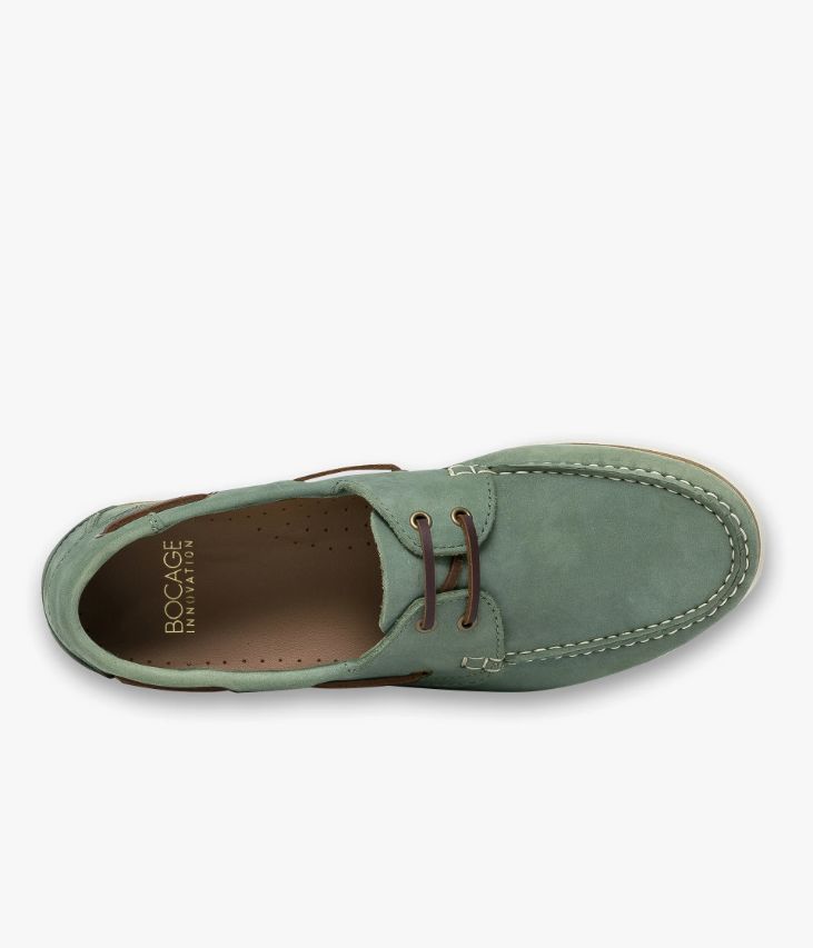 Une chaussure bateau vert amande en nubuck fabriquée avec soin au Portugal. Une chaussure estivale au coloris uniforme avec lacet en cuir marron. Une chaussure avec semelle intérieure cuir dotée d’une fine mousse. Elle repose sur une semelle blanche en caoutchouc véritable avec trépointe cuir. Notre technologie Bocage Innovation vous garantit un bien-être inégalé. La semelle dissimule des élastiques qui permettent à votre chaussure de s’adapter à votre pied.