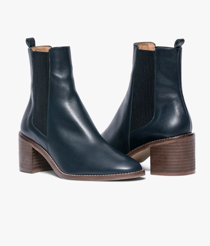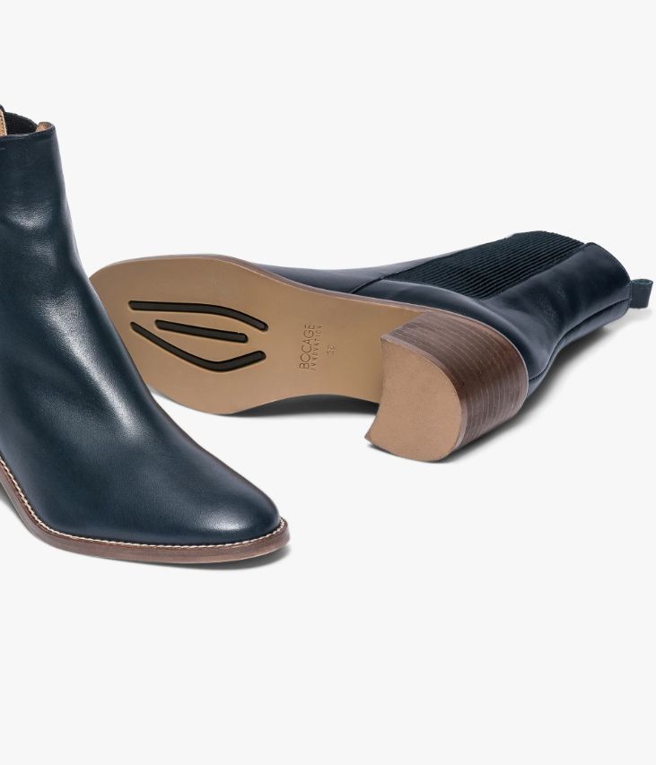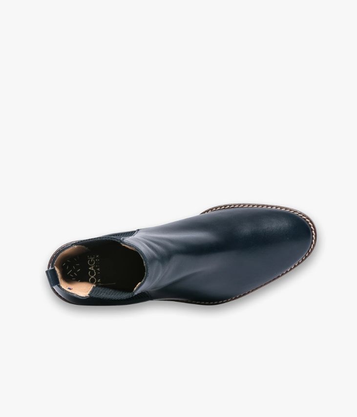 Chelsea boots en cuir lisse marine avec élastiques côtelés. Un Chelsea boots marine très féminin avec son dessus en cuir lisse, son bout amande et ses élastiques côtelés sur les côtés. Il est posé sur une semelle marron avec trépointe cuir surpiquée qui ajoute une touche de style. Cette chaussure possède la technologie brevetée Bocage Innovation, ainsi votre chaussure s'adaptera aux largeurs de votre pied et vous garantira un bien-être inédit. A noter, sa tirette à l'arrière du pied qui facilite le chaussant. Un boots entièrement doublé cuir avec semelle intérieure cuir. Chaussure fabriquée en France. Talon lamellé collé 6 cm. Tige 14 cm. Un boots facile à marier avec l’ensemble du vestiaire.