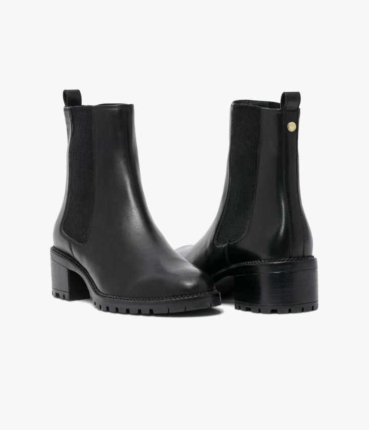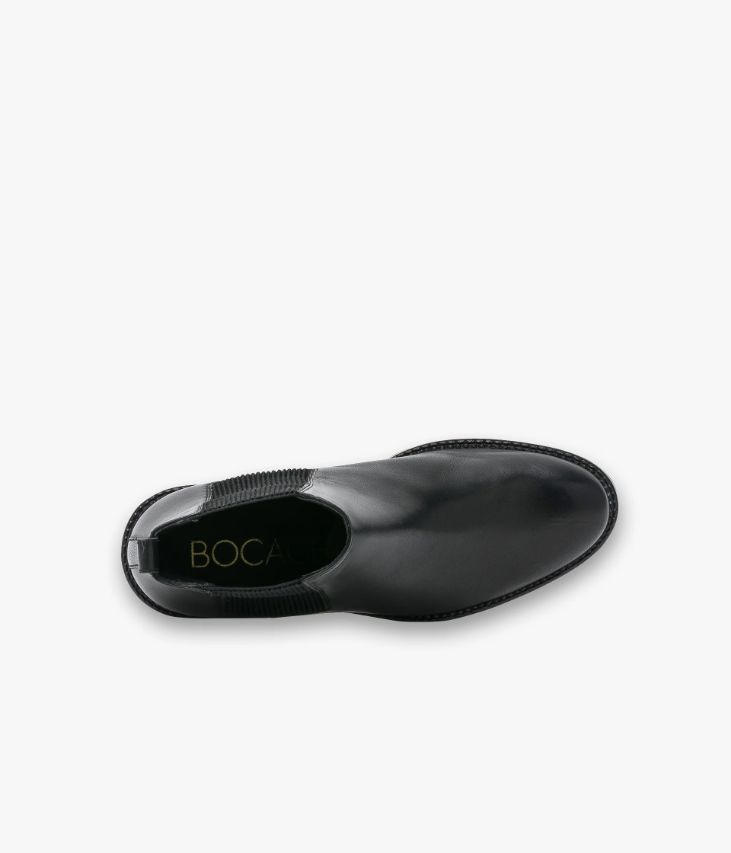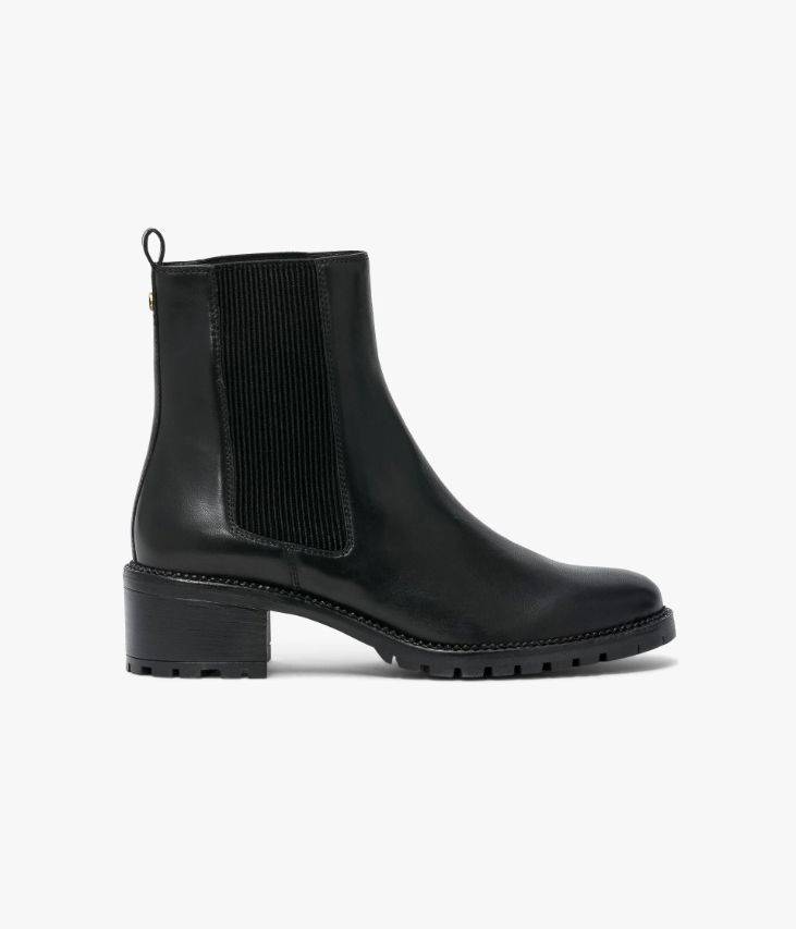 Un Chelsea boots en cuir lisse noirconfectionné avec soin. Un boots doté de deux élastiques côtelés et d’unetirette au talon pour faciliter l’enfilage. Sa ligne effilée avec bout amandecontraste avec une semelle crantée avec large trépointe ciselée. Un bootsentièrement doublé cuir avec semelle intérieure cuir dotée d’une fine mousse. Œilletdoré décoratif à l’arrière.