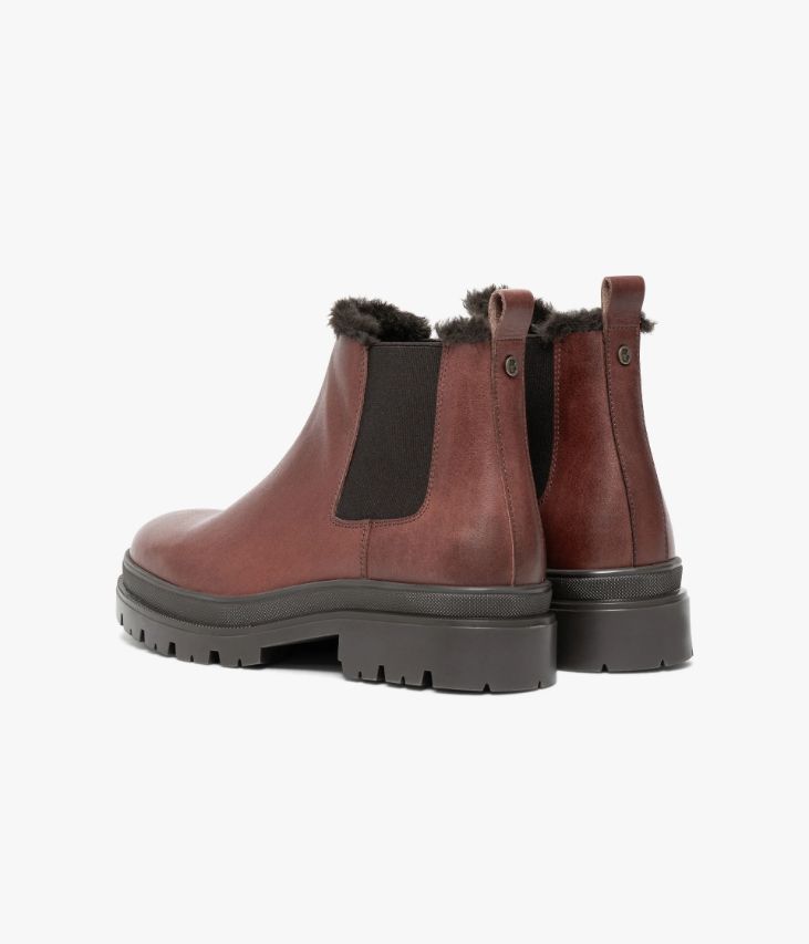 Un Chelsea boots en cuir cognac fabriqué avec soin dans notre atelier au Portugal. Un boots citadin à l’allure résolument décontractée avec son col en fausse fourrure. Doublé d’un textile chaud et doté d’une semelle intérieure cuir moussée, il offre un grand confort. Ce boots s’enfile facilement grâce à ses élastiques latéraux et repose sur une épaisse semelle crantée avec trépointe ciselée. Semelle 3 cm.