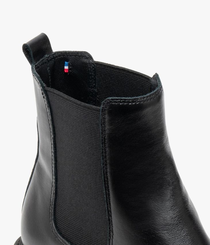 Un Chelsea boots en cuir noir fabriqué avec soin dans notre propre atelier en France, au cœur du Maine et Loire (49). Ce boots à la ligne intemporelle possède un bout amande, des élastiques latéraux ton sur ton et une tirette à l’arrière qui facilite l’insertion du pied. Une chaussure doublée cuir avec semelle intérieure cuir dotée d’une fine mousse. Elle repose sur une semelle débordante avec trépointe cuir ciselée soulignée par une piqûre, et un talon lamellé collé. Notre technologie Bocage Innovation vous garantit un bien-être inégalé. La semelle dissimule des élastiques qui permettent à votre chaussure de s’adapter à votre pied. Logo en métal brossé à l’arrière de la tige.