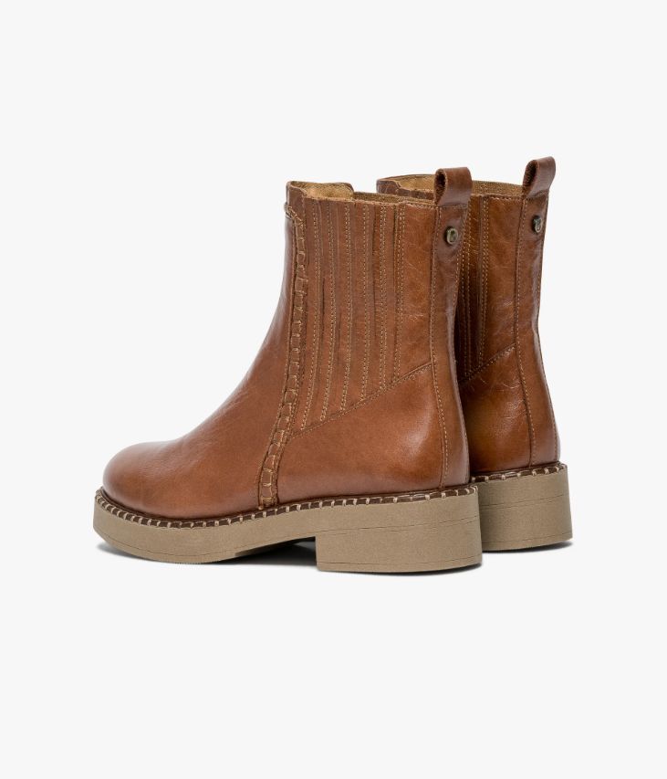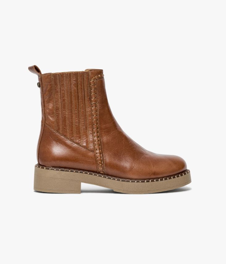 Un Chelsea boots en cuir cognac fabriqué avec soin au Portugal. Avec sa tige en cuir vintage agrémentée de piqûres « échelle » sur les côtés et sur la trépointe, ce boots femme ajoutera une touche de réconfort à toutes les tenues citadines. Il est doté d’élastiques latéraux recouverts de languettes de cuir et d’une tirette au talon, facilitant l’insertion du pied. Une chaussure doublée cuir avec semelle intérieure cuir moussée. Elle repose sur une semelle souple de 2 cm et un large talon. Son cuir vintage est un cuir d'aspect vieilli qui se patine avec le temps, un cuir brillant qui affiche un aspect plus ou moins froissé, dont la tonalité peut varier, et qui peut avoir un aspect "déjà porté".