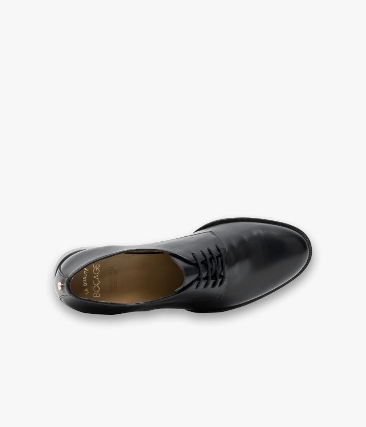 Un derby noir en cuir lisse fabriqué avec soin dans notre atelier en France, au cœur du Maine et Loire (49). Un modèle sobre et élégant, avec bout amande, fermé par des lacets ronds, facile à associer avec l’intégralité du dressing. Cette chaussure, entièrement doublée cuir, possède une semelle intérieure cuir dotée d’une fine mousse. Elle repose sur une semelle débordante avec trépointe cuir ciselée. Notre technologie Bocage Innovation vous garantit un bien-être inégalé. La semelle dissimule des élastiques qui permettent à votre chaussure de s’adapter à votre pied.