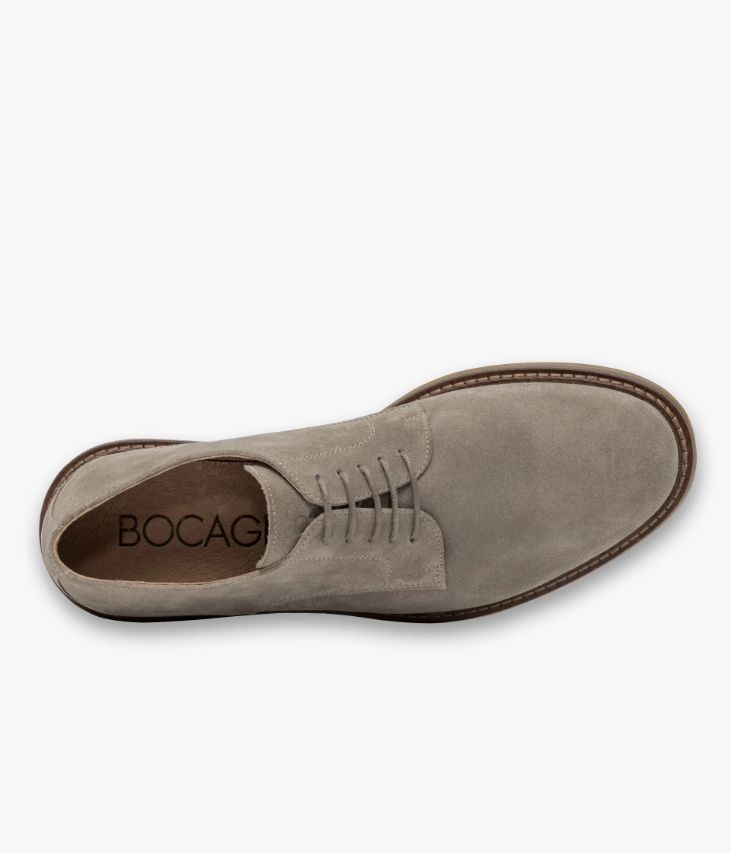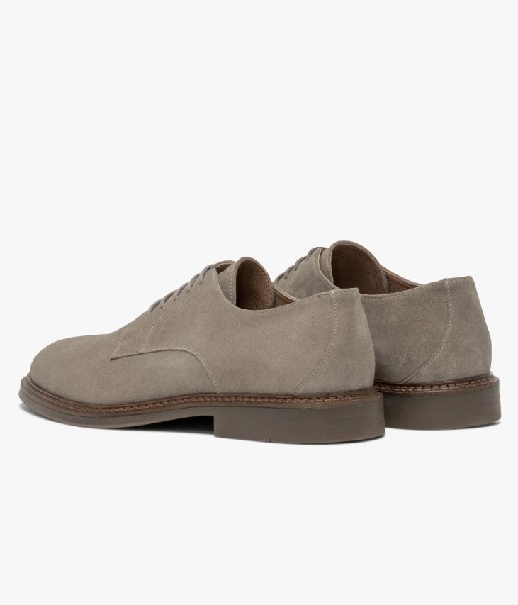 Un derby en cuir velours grège fabriqué avec soin au Portugal. Un modèle à la fois élégant et décontracté affichant une ligne intemporelle posé sur une semelle débordante en gomme avec trépointe cuir piquée. Il arbore un logo embossé sur la languette et se ferme par des lacets ronds ton sur ton. Une chaussure partiellement doublée cuir avec semelle intérieure cuir dotée d’une fine mousse.