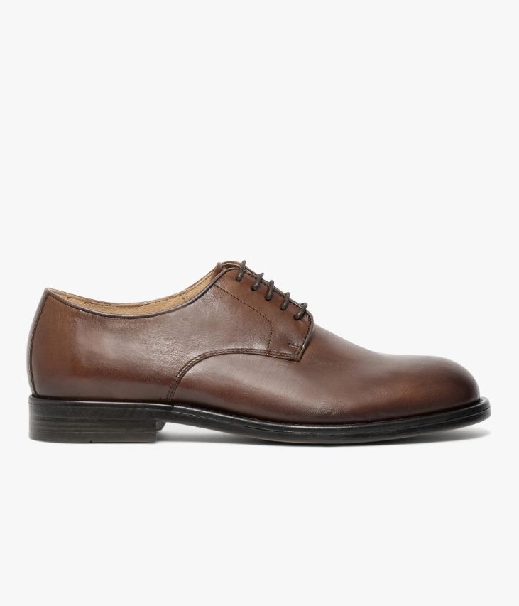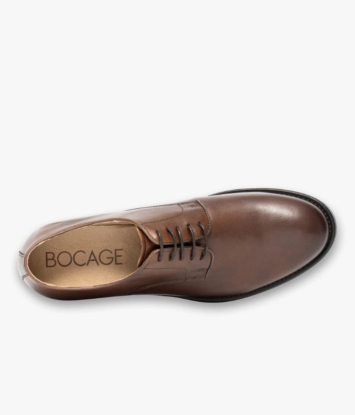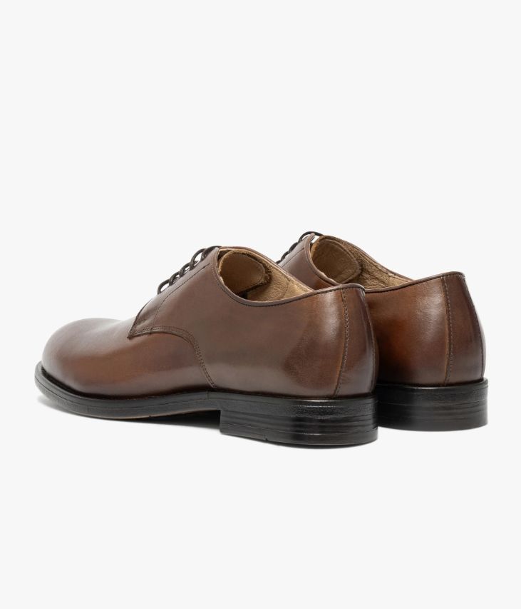 Un derby en cuir cognac fabriqué avec soin au Portugal. Cette chaussure élégante compte parmi les essentiels du vestiaire masculin et accompagne les pantalons de costume comme les jeans. Elle affiche un bout arrondi avec effet patiné et des quartiers soulignés par un élégant passepoil. Une chaussure de costume entièrement doublée cuir avec semelle intérieure cuir moussée. Son cuir vintage est un cuir d'aspect vieilli qui se patine avec le temps, un cuir brillant qui affiche un aspect plus ou moins froissé, dont la tonalité peut varier, et qui peut avoir un aspect "déjà porté".