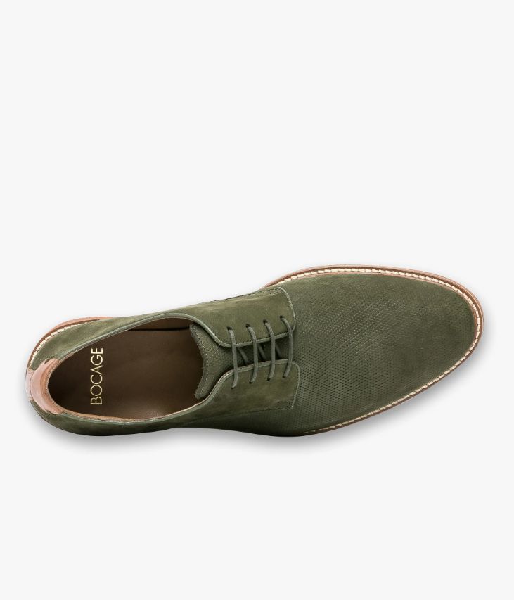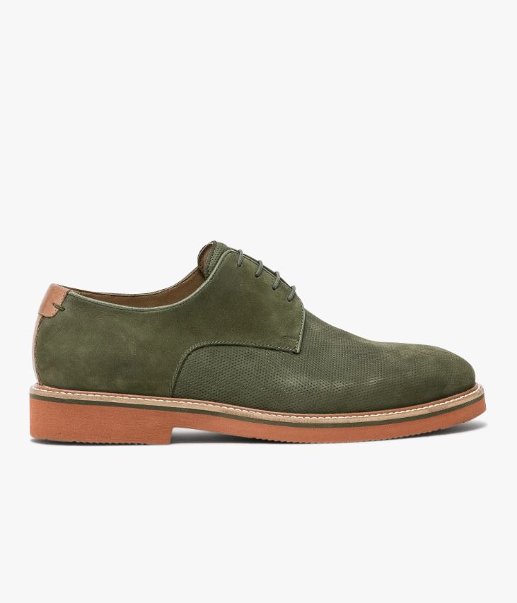 Un derby vert en cuir nubuck fabriqué avec le plus grand soin. Il affiche un aspect perforé sur l’avant et est agrémenté d’une touche de cuir lisse camel au talon. Une chaussure de ville entièrement doublée cuir avec semelle intérieure cuir dotée d’une fine mousse. Elle est posée sur une épaisse semelle couleur brique très légère, avec trépointe surpiquée. Fermeture par lacets ronds ton sur ton.