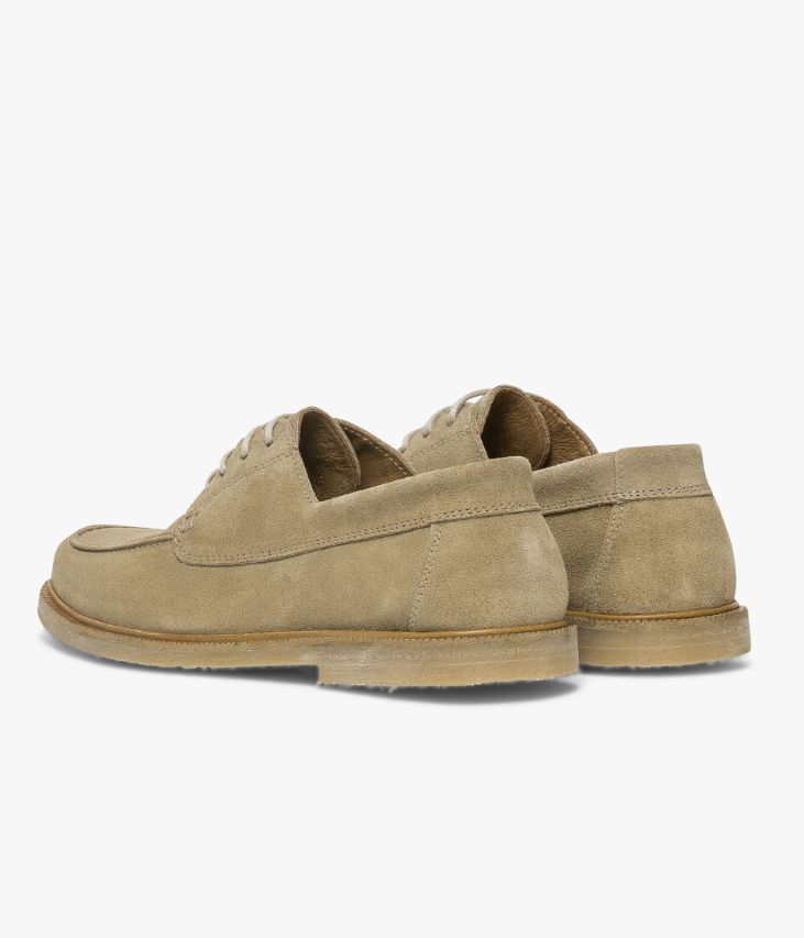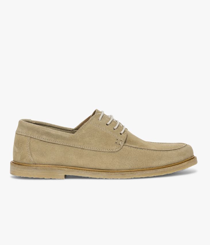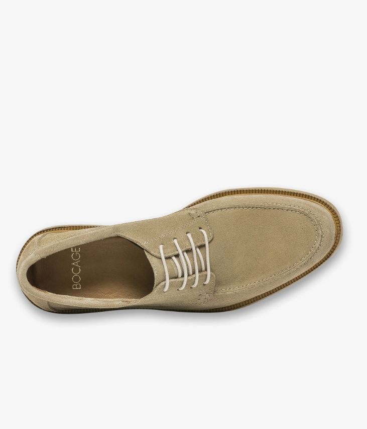 Un derby beige en cuir velours fabriqué avec soin dans notre atelier au Portugal. Une chaussure élégante avec bout amande et surpiqûres décoratives. Elle est doublée cuir et textile avec semelle intérieure cuir dotée d’une fine mousse. Elle repose sur une semelle en crêpe avec trépointe cuir ciselée. Fermeture par lacets ronds.