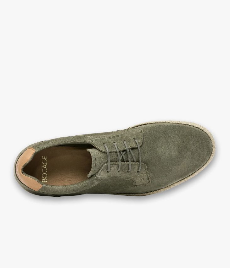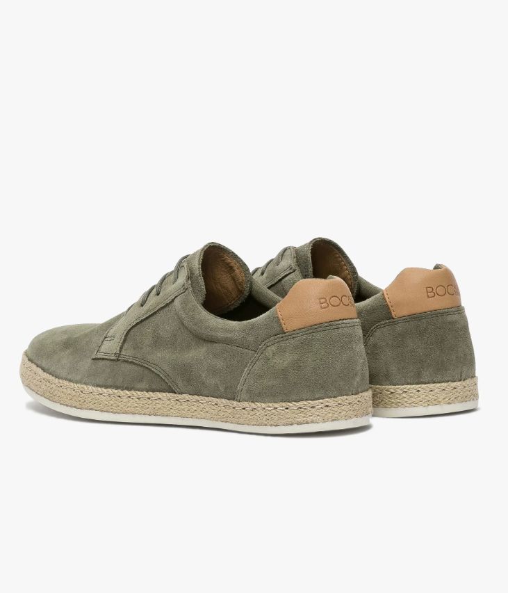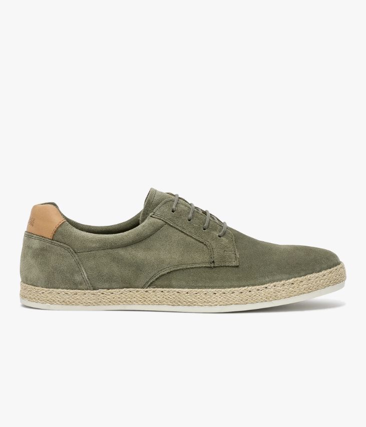 Un derby kaki en cuir velours fabriqué avec soin au Portugal. Un modèle décontracté posé sur une semelle en caoutchouc bordée de corde tressée, avec empiècement en cuir lisse camel au talon. Une chaussure doublée textile avec semelle intérieure cuir dotée d’une fine mousse. Cette paire bénéficie d’un cousu latéral qui consiste à relier la tige et la semelle. Cette technique apporte une réelle robustesse et souplesse au produit. Fermeture par lacets ronds.