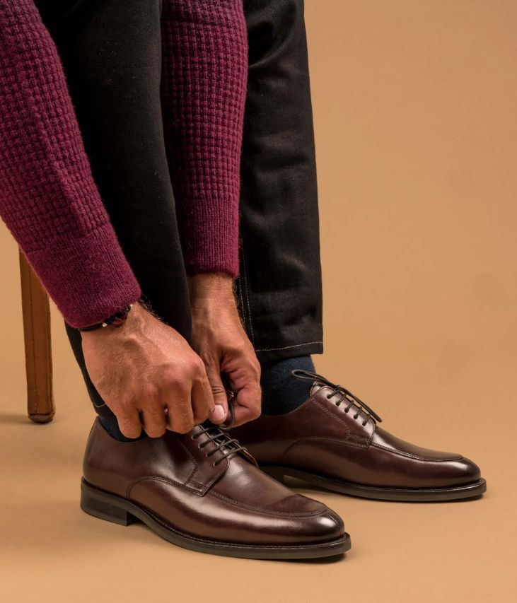 Un derby simple boucle en cuir lisse cognac fabriqué avec le plus grand soin. Une chaussure de costume à la ligne effilée avec bout amande offrant élégance et raffinement. Ce modèle est entièrement doublé cuir avec semelle intérieure cuir dotée d’une fine mousse. Elle repose sur une semelle avec trépointe cuir piquée et talon lamellé collé. Notre technologie Bocage Innovation vous garantit un bien-être inégalé. La semelle dissimule des élastiques qui permettent à votre chaussure de s’adapter à votre pied. Cette paire bénéficie du cousu Blake, une couture unique prenant, à la fois, la semelle intérieure, la semelle extérieure et la tige de la chaussure. Ce montage est apprécié pour la finesse de la semelle. Elastique sous la boucle.