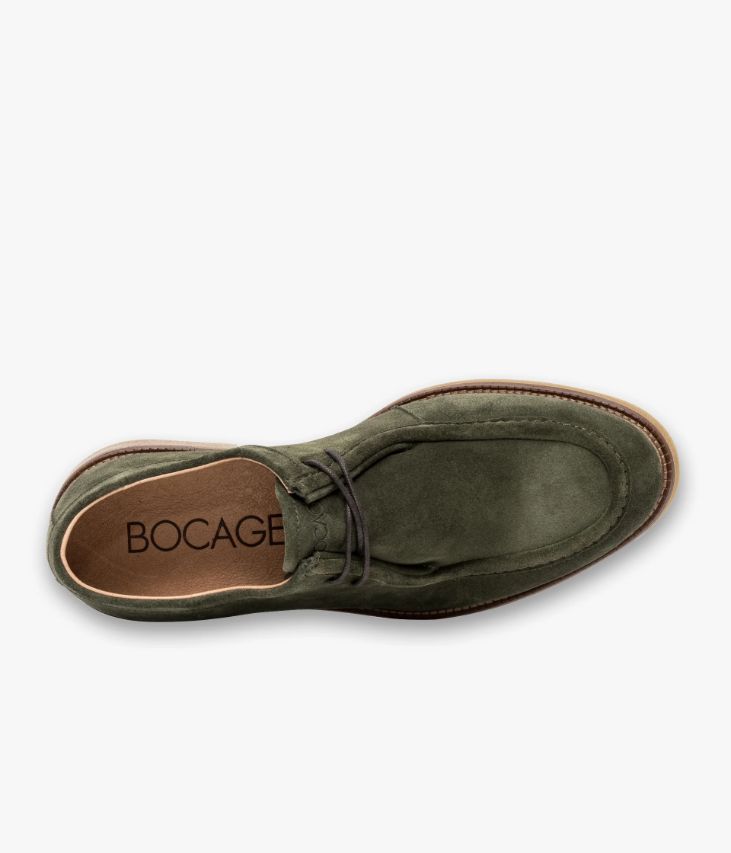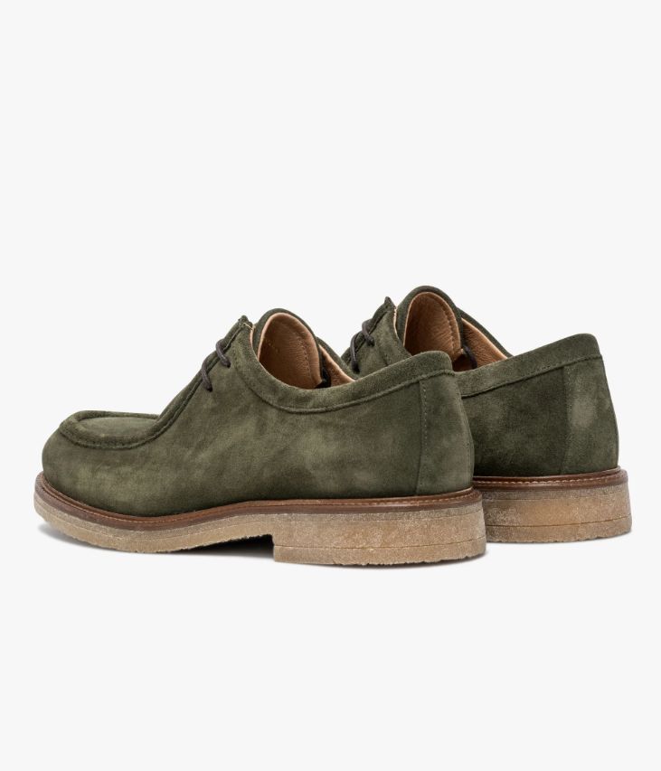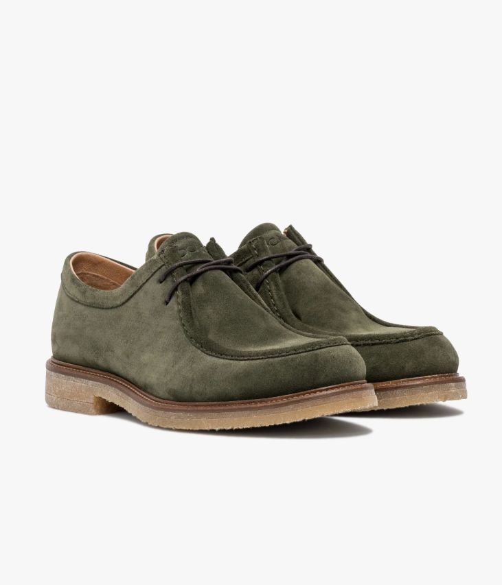 Un derby plateau en cuir velours kaki fabriqué avec soin au Portugal. Un modèle entre sophistication et décontraction, doté d’une surpiqûre en relief sur le plateau et fermé par des lacets ronds cirés. Une chaussure entièrement doublée cuir avec semelle intérieure cuir dotée d’une fine mousse. Elle repose sur une semelle aspect crêpe avec trépointe cuir piquée.