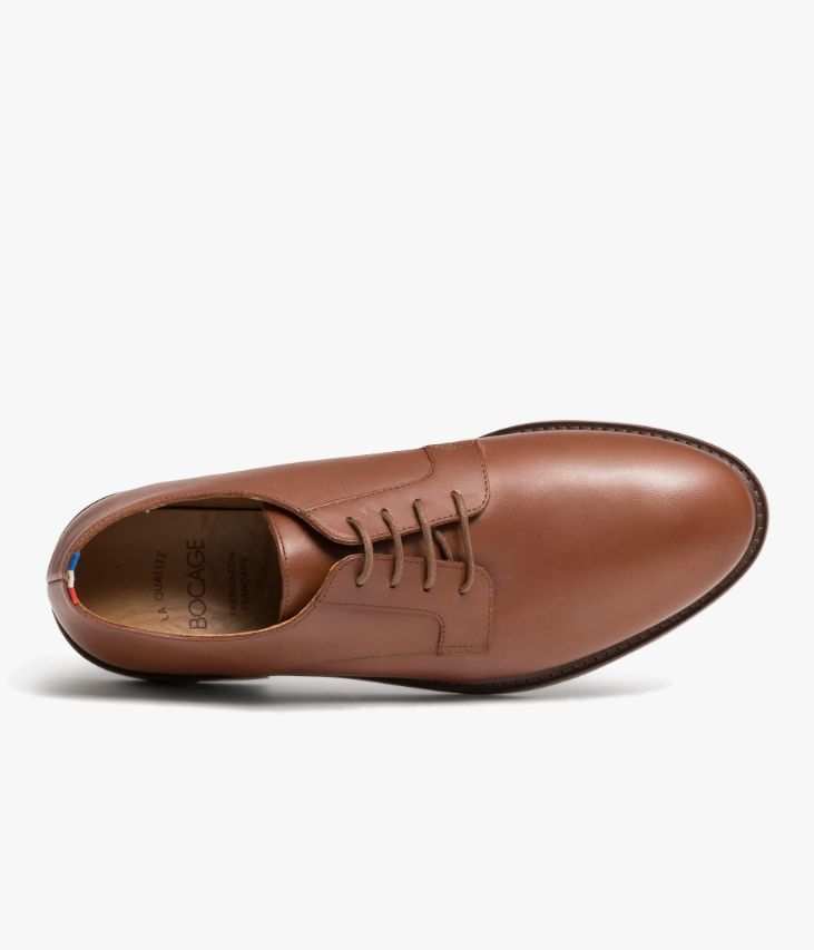 Un derby cognac en cuir lisse fabriqué avec soin dans notre propre atelier en France, au cœur du Maine et Loire (49). Une chaussure élégante qui compte parmi les essentiels du vestiaire masculin. Elle se ferme grâce à des lacets ronds et repose sur une semelle avec trépointe cuir piquée. Notre technologie Bocage Innovation vous garantit un bien-être inégalé. La semelle dissimule des élastiques qui permettent à votre chaussure de s’adapter à votre pied. Une chaussure entièrement doublée cuir avec semelle intérieure cuir dotée d’une fine mousse. Le cuir Crust est un cuir à tannage végétal qui est ensuite teinté à plusieurs reprises sur forme pour donner cet effet de patine si particulier, qui va évoluer au fil du temps au fil des entretiens réguliers. Petit drapeau tricolore au talon.