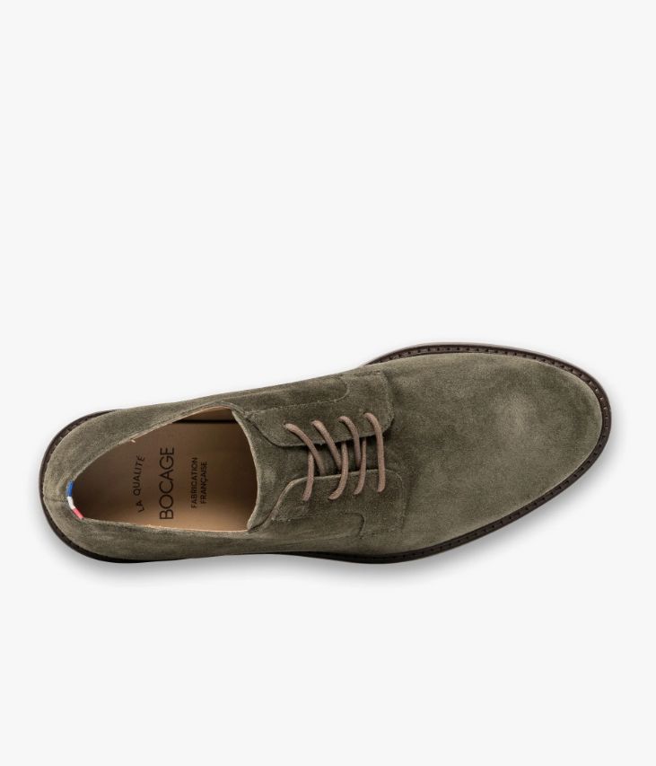 Un derby kaki en cuir velours fabriqué avec soin dans notre propre atelier en France, au cœur du Maine et Loire (49). Une chaussure élégante qui compte parmi les essentiels du vestiaire masculin. Elle se ferme grâce à des lacets ronds et repose sur une semelle avec trépointe cuir piquée. Notre technologie Bocage Innovation vous garantit un bien-être inégalé. La semelle dissimule des élastiques qui permettent à votre chaussure de s’adapter à votre pied. Une chaussure entièrement doublée cuir avec semelle intérieure cuir dotée d’une fine mousse. Petit drapeau tricolore au talon.