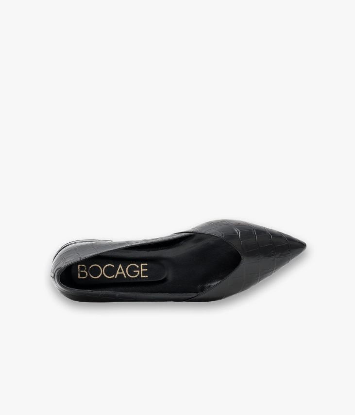 Un escarpin noir en cuir embossé façon croco fabriqué avec soin au Portugal. Une chaussure chic avec bout pointu et décolleté en V reposant sur une semelle fine et un petit talon encastré enrobé de cuir. Cet escarpin est entièrement doublé cuir et doté d’une semelle intérieure cuir intégrant une fine couche de mousse. Un modèle confortable et facile à porter le jour comme le soir.