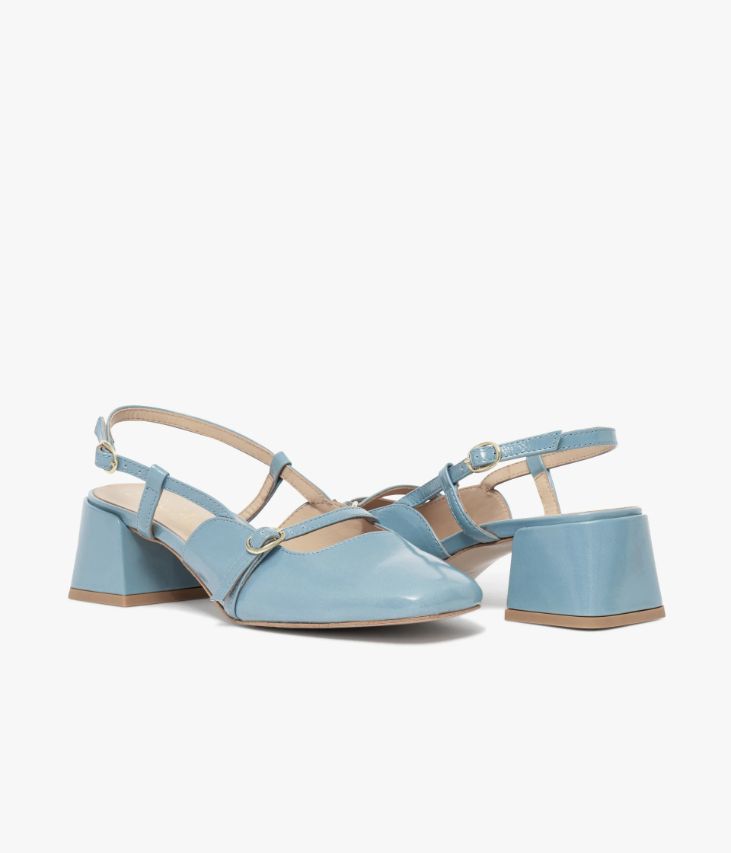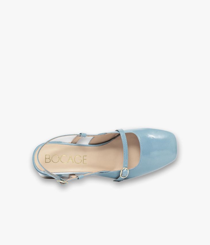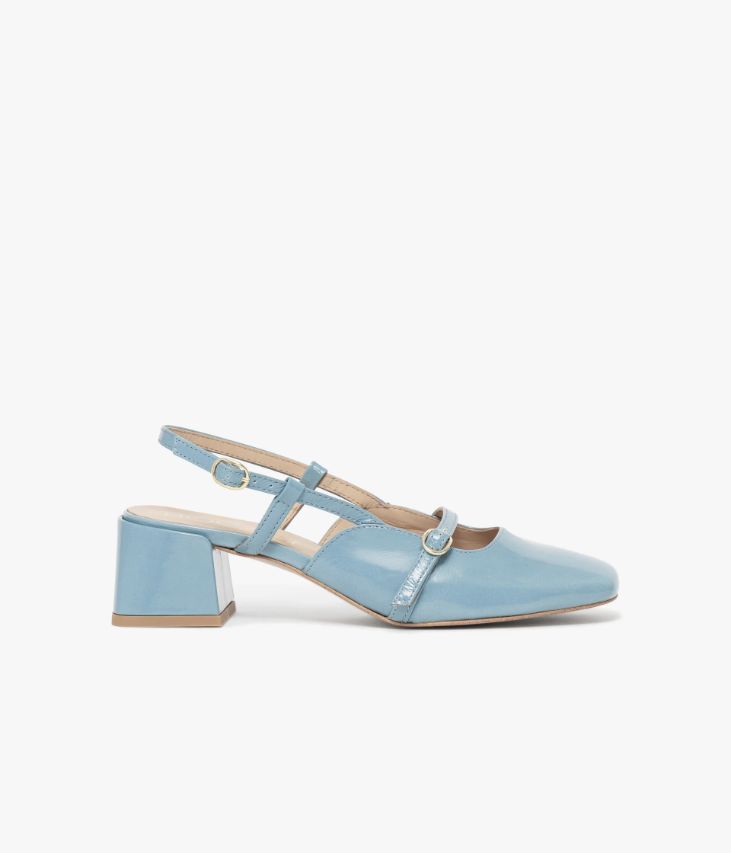 Un escarpin sling-back en cuir verni bleu fabriqué avec soin au Portugal. Un modèle inspiré d’un classique revisité avec modernité, arborant un bout carré et un large talon enrobé. Il possède une fine bride sur le décolleté et une bride arrière fermées par de fines boucles dorées. Un escarpin entièrement doublé cuir avec semelle intérieure cuir dotée d’une fine mousse. Ce cuir Naplak particulièrement souple peut présenter un aspect légèrement froissé.