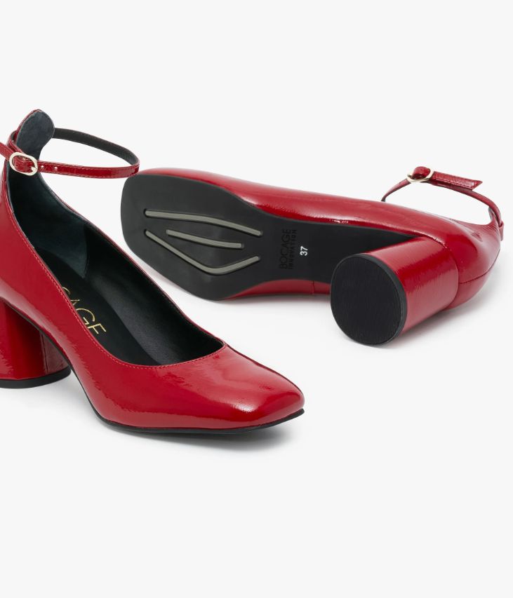 Un escarpin en cuir verni rouge griotte fabriqué avec le plus grand soin. Une chaussure élégante aux allures rétro avec son bout carré et sa fine bride autour du talon fermée par une fine boucle dorée. Elle repose sur une semelle fine et un talon flare de forme ronde au look singulier. Notre technologie Bocage Innovation vous garantit un bien-être inégalé. La semelle dissimule des élastiques qui permettent à votre chaussure de s’adapter à votre pied. Un escarpin entièrement doublé cuir avec semelle intérieure cuir dotée d’une fine mousse.