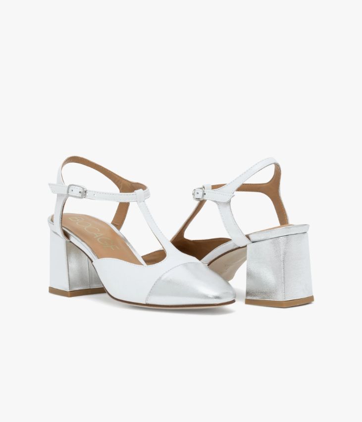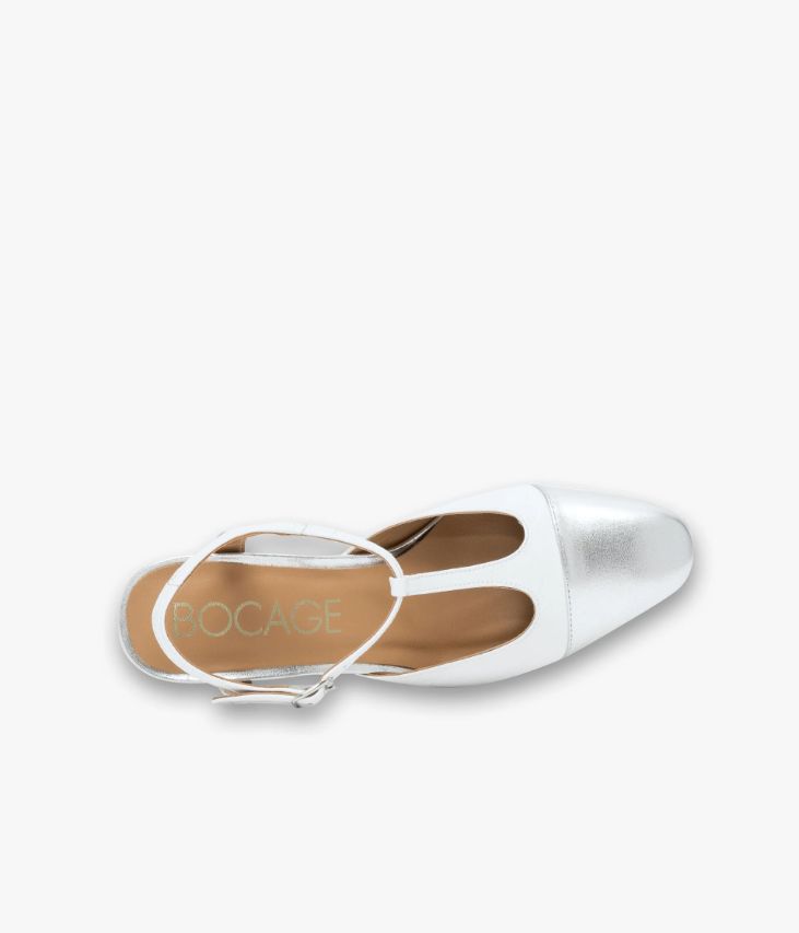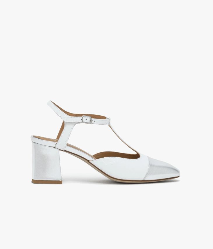 Un escarpin Salomé blanc et argent fabriqué avec soin au Portugal. Cet escarpin à talon ouvert se distingue par son bout et son talon carré enrobé en cuir métallisé argent qui jouent les contrastes avec la tige en cuir verni blanc. Sa structure enveloppante, avec bride à la cheville fermée par une boucle argentée, assure un excellent maintien. Une chaussure entièrement doublée cuir avec semelle intérieure cuir dotée d’une fine mousse. Ce cuir Naplak particulièrement souple peut présenter un aspect légèrement froissé.