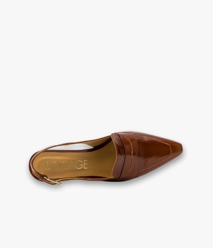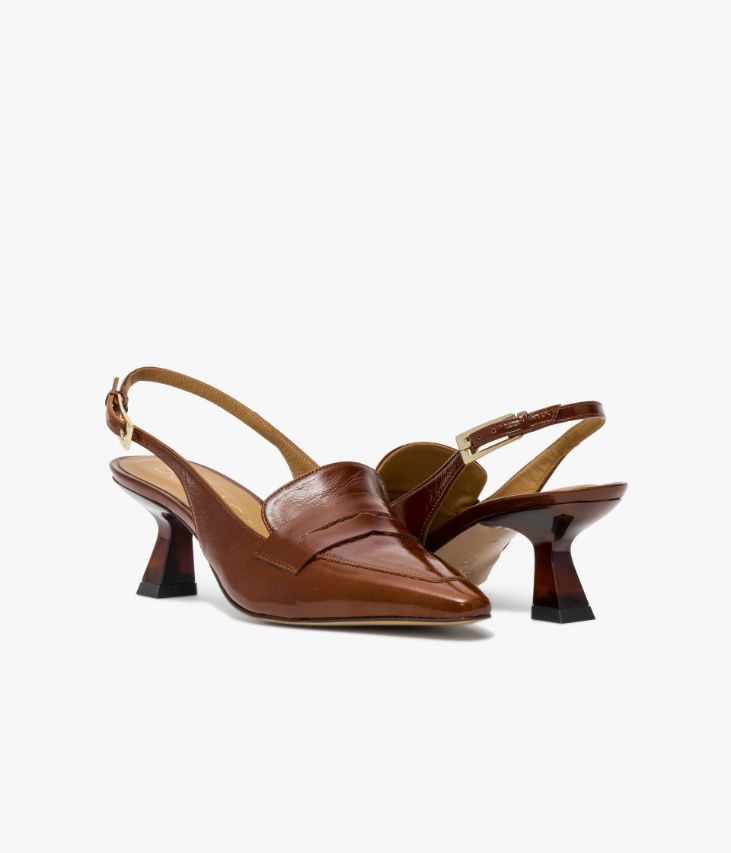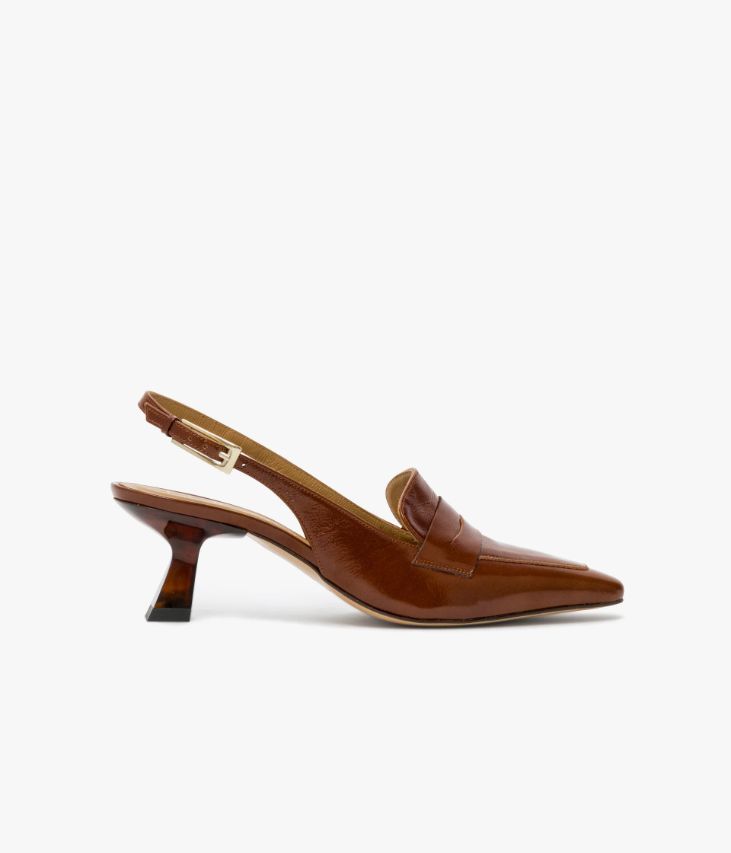 Un mocassin à bride arrière en cuir vintage cognac fabriqué avec soin au Portugal. Un modèle à la fois chic et audacieux qui bouscule les codes avec sa silhouette mocassin à bout carré ultra effilé et sa fine bride fermée par une boucle dorée raffinée. Ce mocassin singulier repose sur une semelle fine et un talon kitten-heel en résine aux reflets marbrés, assurant une parfaite stabilité. Son cuir vintage est un cuir d'aspect vieilli qui se patine avec le temps, un cuir brillant qui affiche un aspect plus ou moins froissé, dont la tonalité peut varier, et qui peut avoir un aspect "déjà porté". Une chaussure entièrement doublée cuir avec semelle intérieure cuir dotée d’une fine mousse.