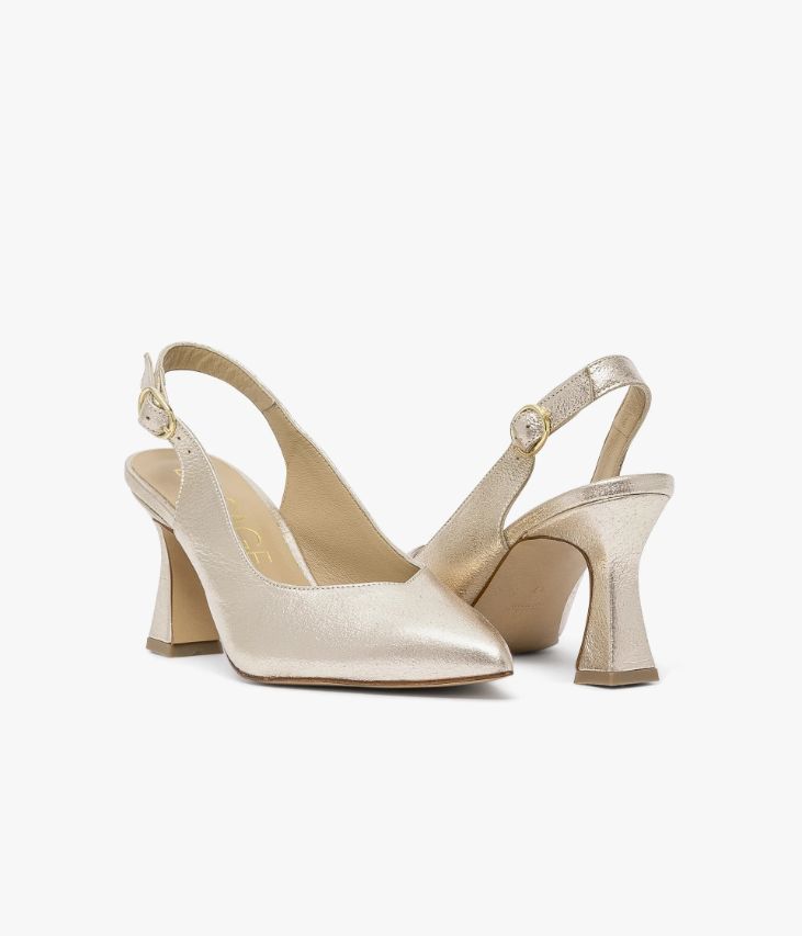 Un escarpin à bride arrière platine en cuir métallisé craquelé fabriqué avec soin au Portugal. Ultra chic avec son bout pointu et son décolleté en V, il repose avec élégance sur un talon sablier enrobé et se ferme à l’aide d’une boucle dorée. Une chaussure entièrement doublée cuir avec semelle intérieure cuir dotée d’une fine mousse, qui sublimera les tenues de cérémonie.