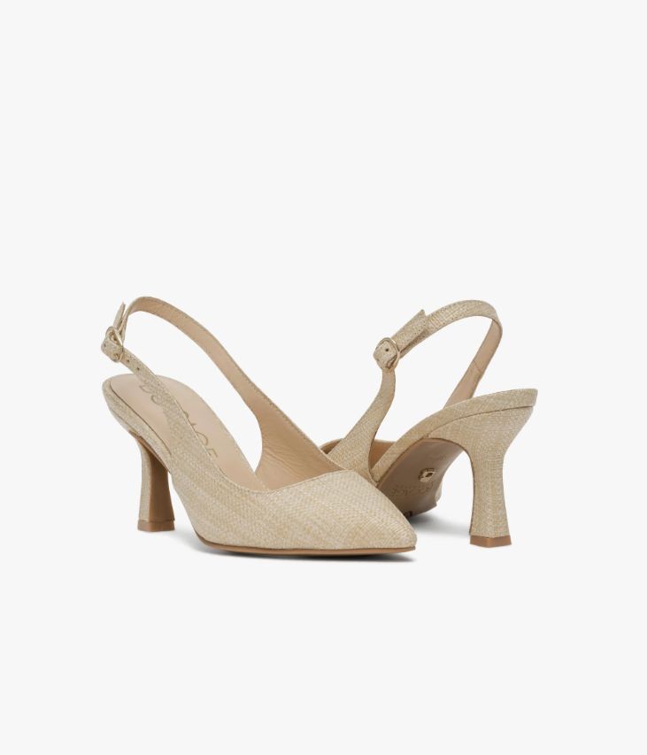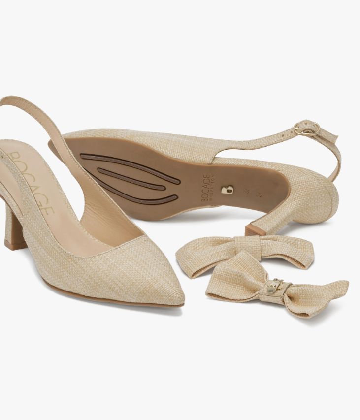 Un escarpin à bride arrière en textile aspect raphia beige fabriqué avec le plus grand soin, qui mêle chic et tendance naturelle. Un modèle doté d’un bout pointu, d’un talon à gorge très féminin et d’une fine bride fermée par une boucle dorée. Sur le dessus, un large nœud papillon amovible, muni d’un clip métallique, ajoute une touche de glamour supplémentaire. Une chaussure entièrement doublée cuir avec semelle intérieure cuir dotée d’une fine mousse. Notre technologie Bocage Innovation vous garantit un bien-être inégalé. La semelle dissimule des élastiques qui permettent à votre chaussure de s’adapter à votre pied. Logo signature sous la semelle.