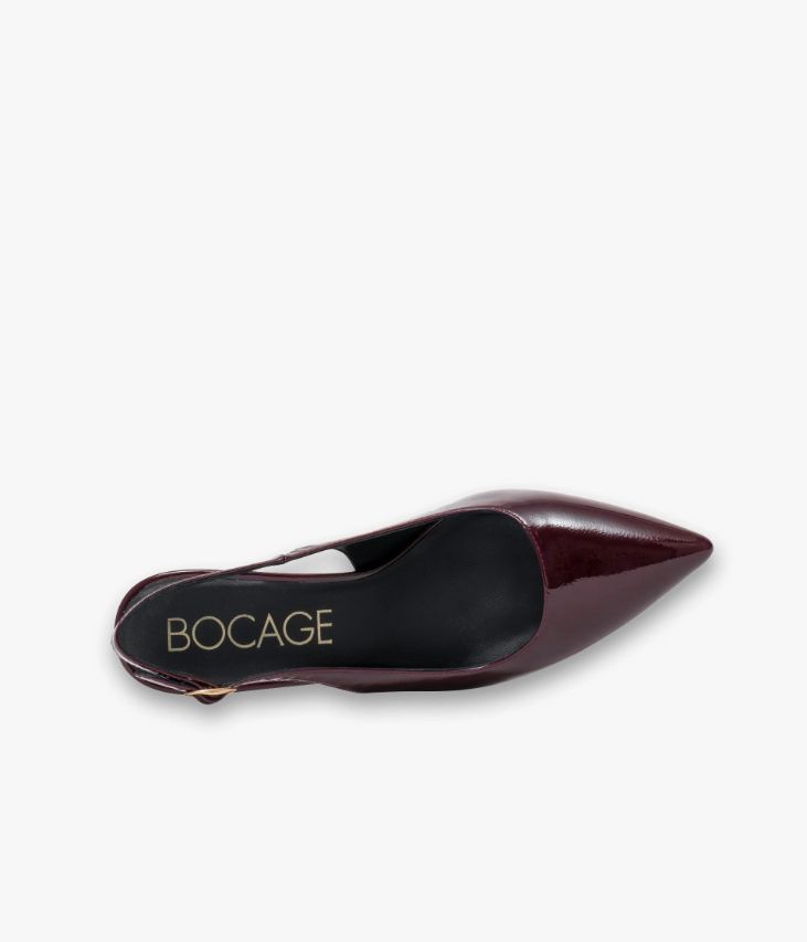 Un escarpin à bride arrière en cuir verni lie-de-vin fabriqué avec le plus grand soin. Un modèle chic et glamour avec son bout pointu, son talon à gorge très féminin et sa fine bride fermée par une boucle dorée. Une chaussure entièrement doublée cuir avec semelle intérieure cuir dotée d’une fine mousse. Notre technologie Bocage Innovation vous garantit un bien-être inégalé. La semelle dissimule des élastiques qui permettent à votre chaussure de s’adapter à votre pied. Cet escarpin ajoutera une touche d’élégance à toutes les tenues, le jour comme le soir. Ce cuir Naplak particulièrement souple peut présenter un aspect légèrement froissé. Logo signature sous la semelle.