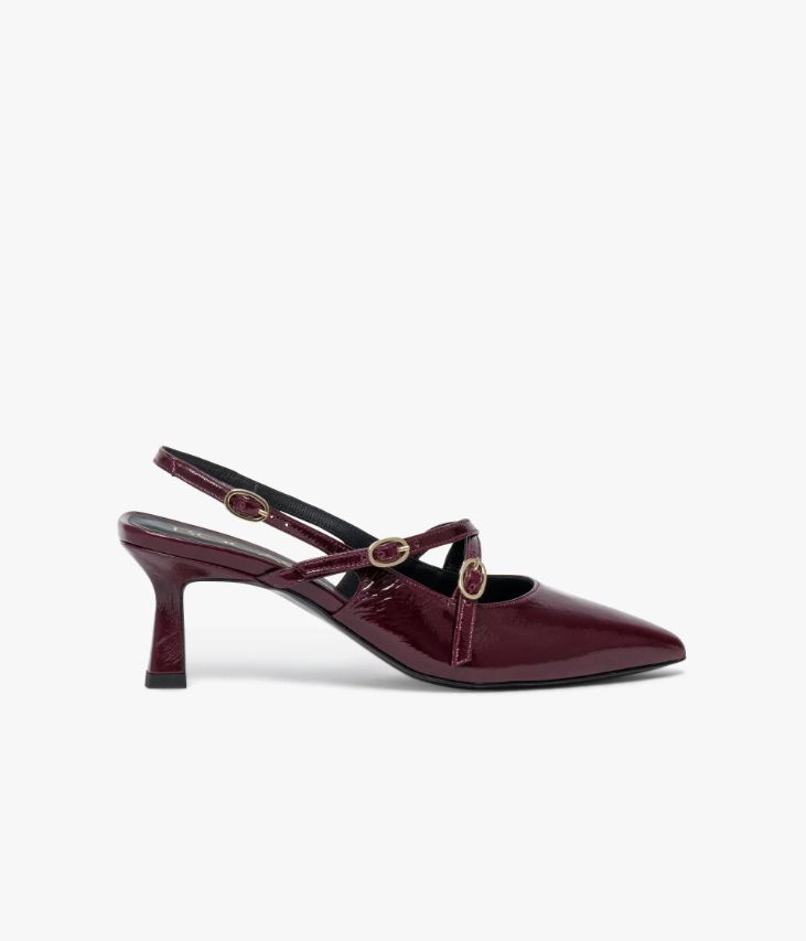 Un escarpin à bride arrière en cuir verni lie-de-vin fabriqué avec soin au Portugal. Un modèle très féminin avec son bout pointu et ses fines brides asymétriques fermées par d’élégantes boucles ovales. Il repose sur une semelle fine et un talon fin ultra chic. Cet escarpin ajoute une touche de sophistication à toutes les tenues élégantes et looks de soirée. Une chaussure entièrement doublée cuir avec semelle intérieure cuir dotée d’une fine mousse. Ce cuir Naplak particulièrement souple peut présenter un aspect légèrement froissé.