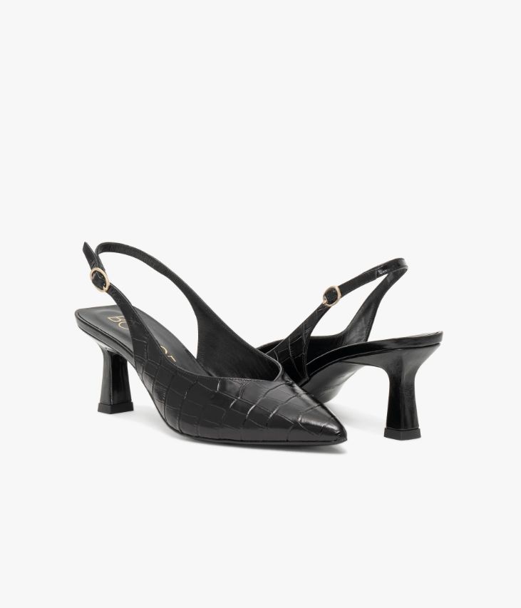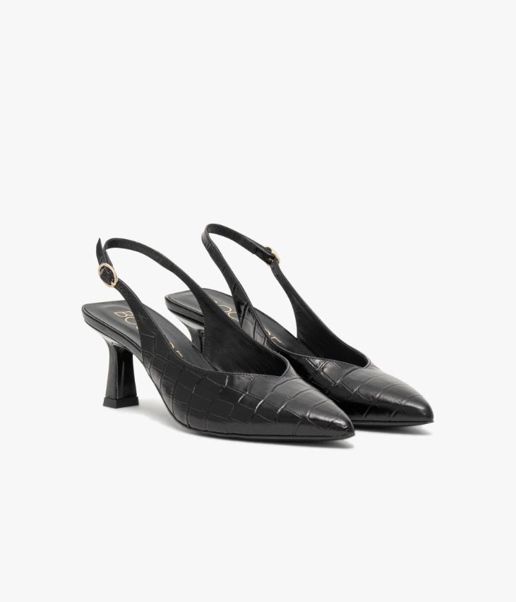 Un escarpin à bride arrière en cuir noir embossé façon croco fabriqué avec soin au Portugal. Un escarpin à bout pointu avec décolleté en V et fine bride fermée par une boucle dorée. Il repose sur une semelle fine et un talon à gorge fin particulièrement élégant. Must-have de la saison, il ajoute une touche de sophistication aux tenues du quotidien et accompagne toutes les tenues de soirée. Une chaussure entièrement doublée cuir avec semelle intérieure cuir dotée d’une fine mousse.