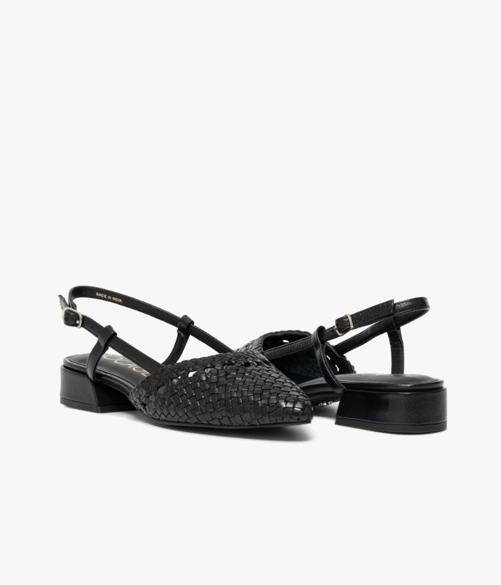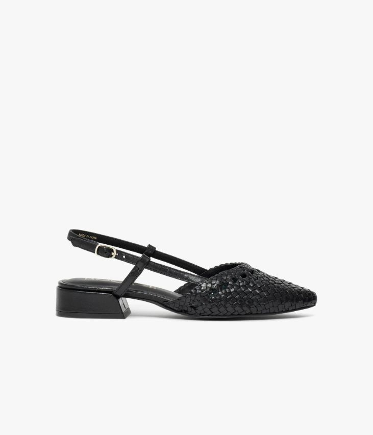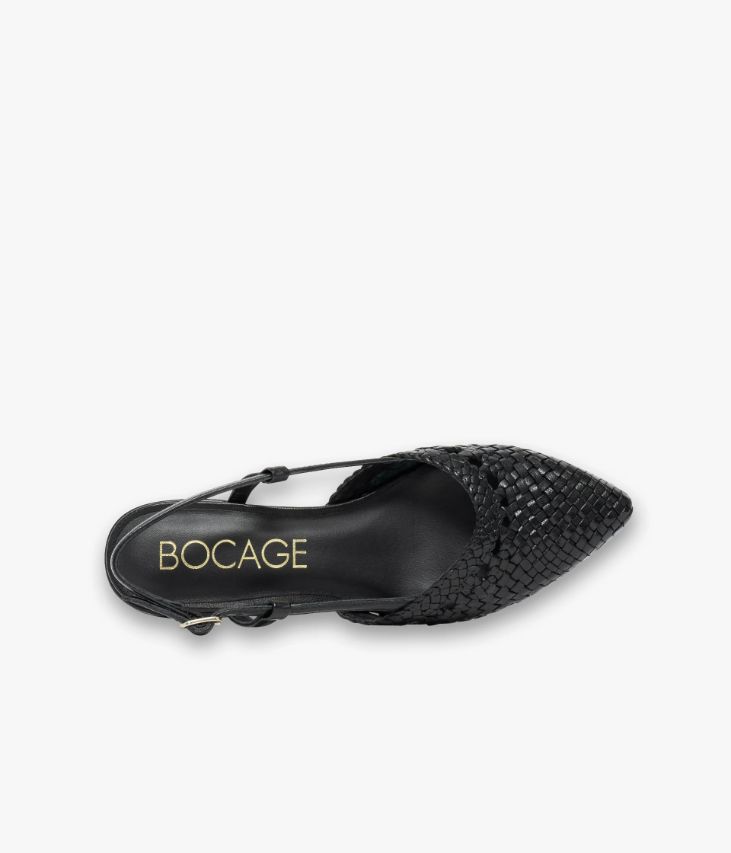 Un escarpin sling-back en cuir noir fabriqué avec le plus grand soin. Doté d’un bout pointu en cuir tressé, il s’adapte à la morphologie du pied tout en le mettant en valeur grâce à une bande ajourée qui borde le décolleté. De fines brides au talon et sur les côtés assurent un excellent maintien tout en ajoutant une touche de féminité. Une chaussure élégante avec semelle intérieure cuir très confortable. Elle repose sur une semelle fine et un petit talon enrobé. Notre technologie Bocage Innovation vous garantit un bien-être inégalé. La semelle dissimule des élastiques qui permettent à votre chaussure de s’adapter à votre pied. Fermeture par boucle dorée.