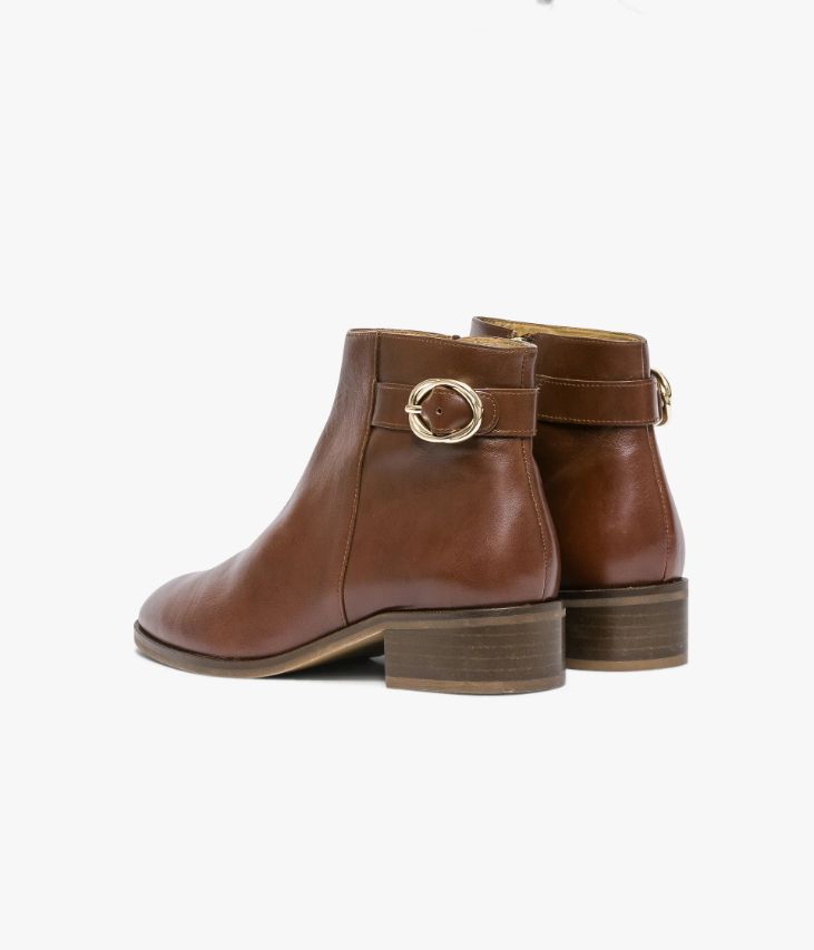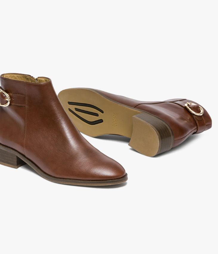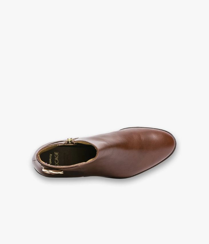 Un low-boots cognac en cuir lisse fabriquéavec soin dans notre propre atelier en France, au cœur du Maine et Loire (49).Il affiche une ligne effilée avec bout amande, juste agrémentée d’une boucledorée sur le côté de la tige. Une chaussure entièrement doublée cuir avec semelleintérieure cuir dotée d’une fine mousse. Elle repose sur une semelle fine avectrépointe cuir ciselée et large talon lamellé collé. Notre technologie Bocage Innovation vous garantit un bien-être inégalé.La semelle dissimule des élastiques qui permettent à votre chaussure des’adapter à votre pied.