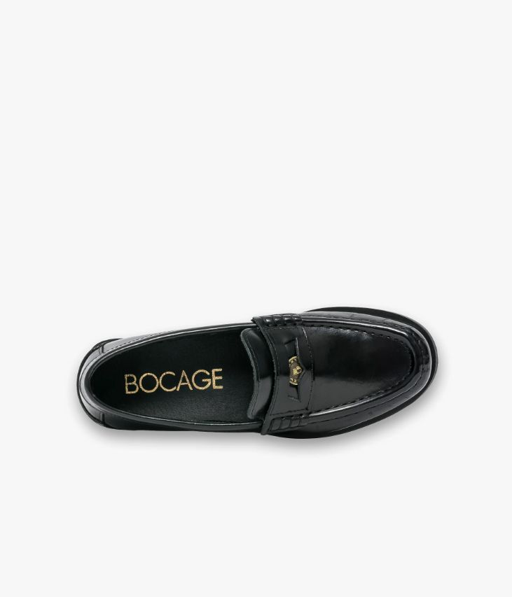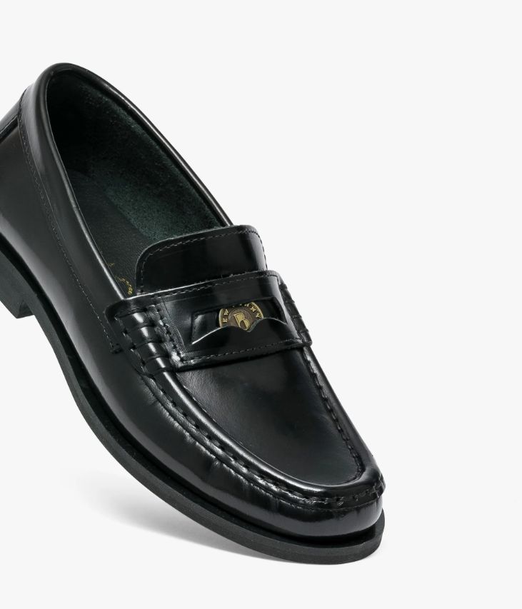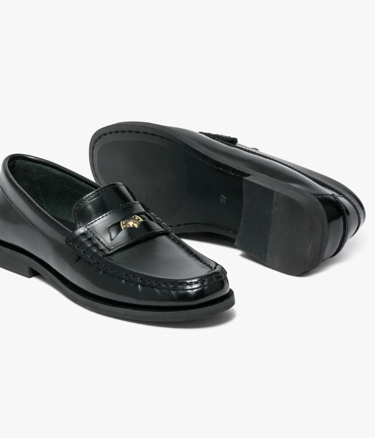 Un mocassin en cuir noir fabriqué avec soin au Portugal. Fabriqué dans un cuir glacé aux reflets brillants, il possède un bout amande et une couture en relief sur le plateau. Le bandeau perforé est mis en valeur par des points selliers et un Penny siglé Bocage amovible ajoutant une touche de chic. Un mocassin femme non doublé avec semelle intérieure cuir moussée. Cette chaussure bénéficie d’un semi cousu mocassin, une technique qui consiste à confectionner la première et la doublure dans une seule pièce de cuir, permettant ainsi l’obtention d’une chaussure très souple.